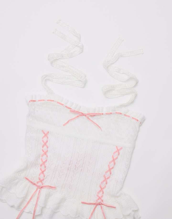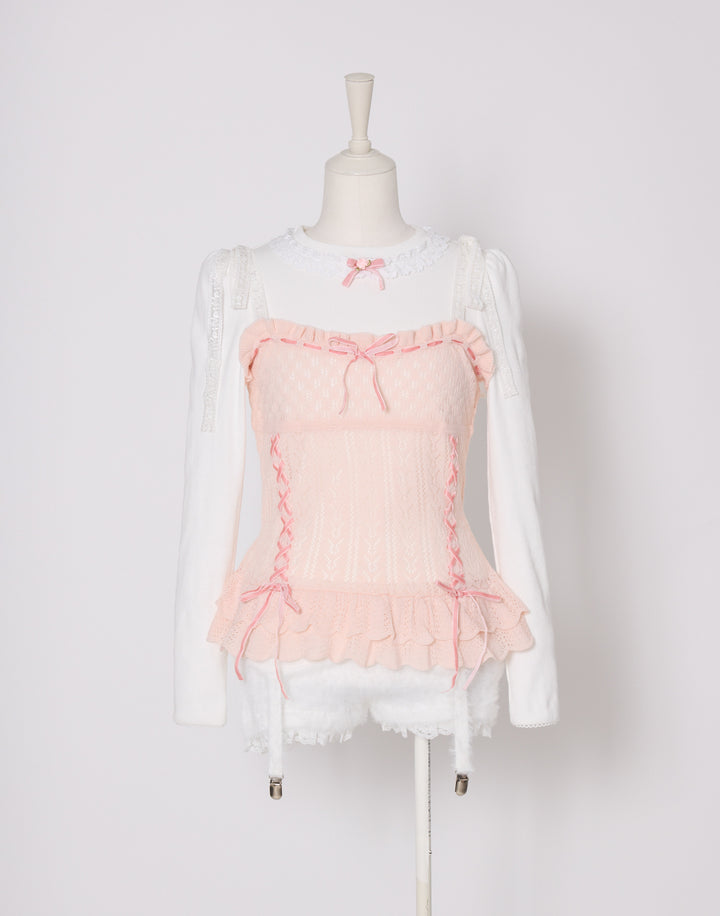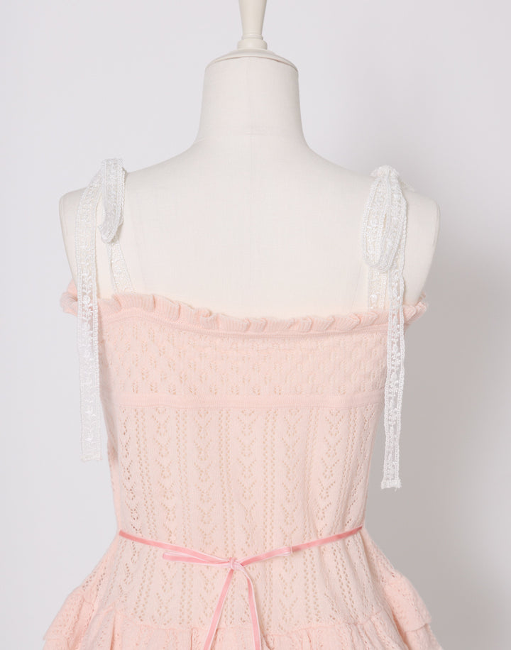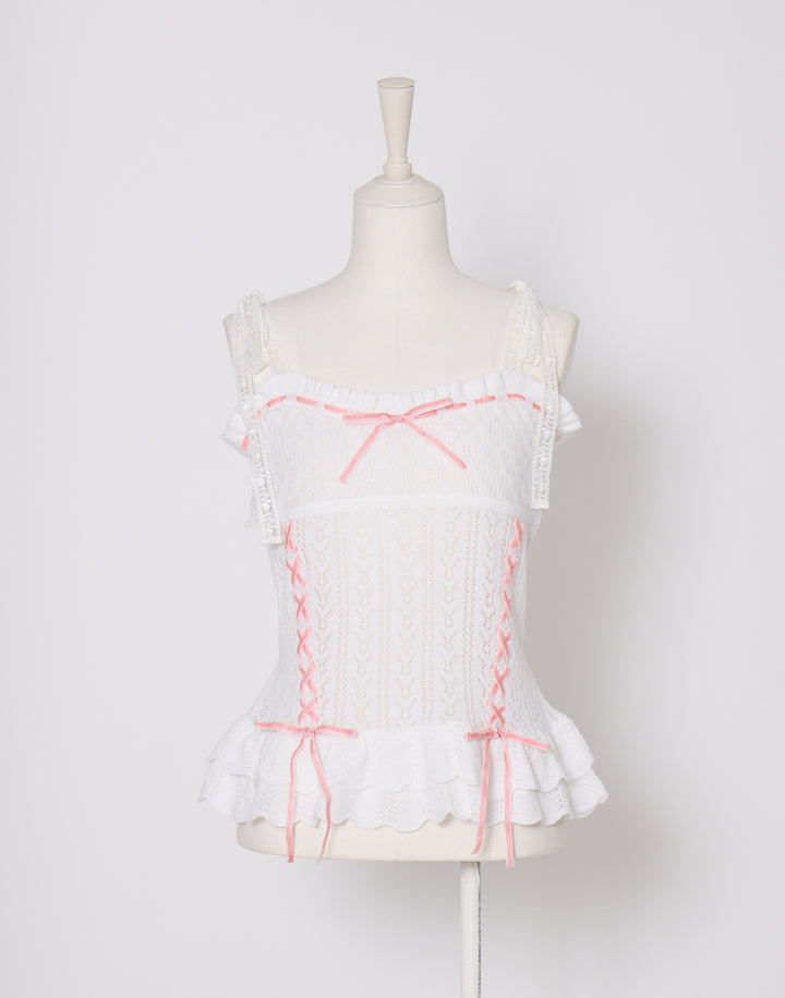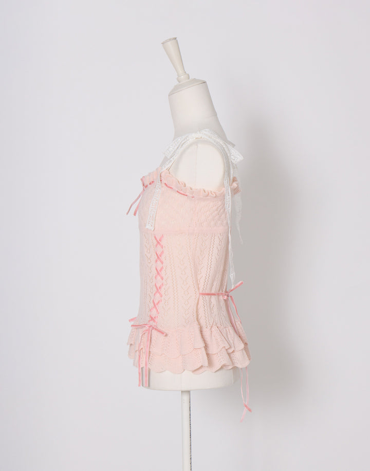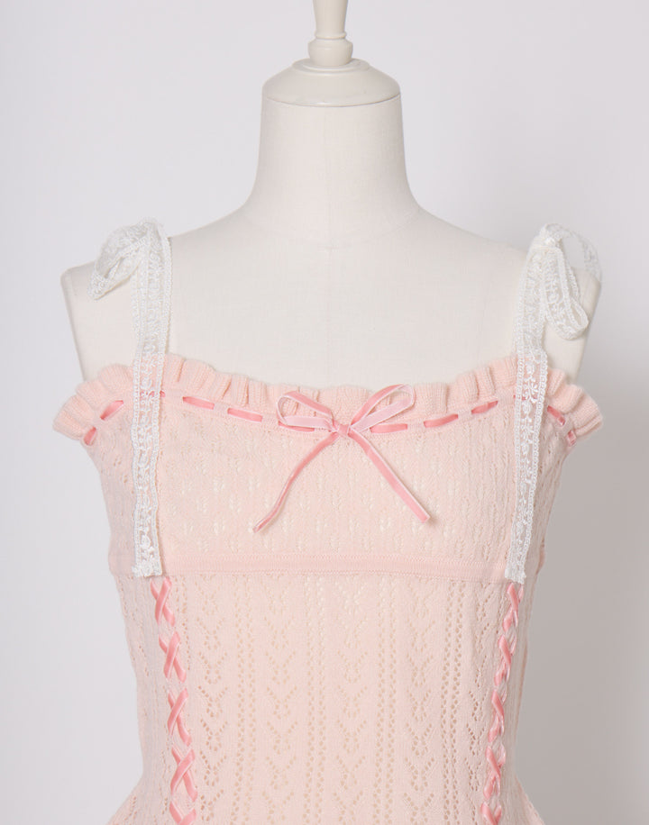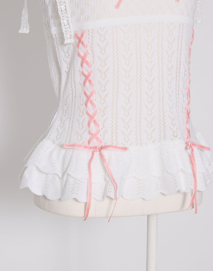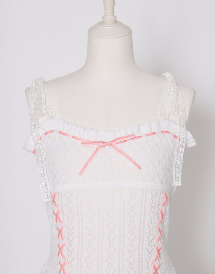 繊細な編地に添えたレースアップがポイント。肩のリボンはお好きな長さに調節できます。