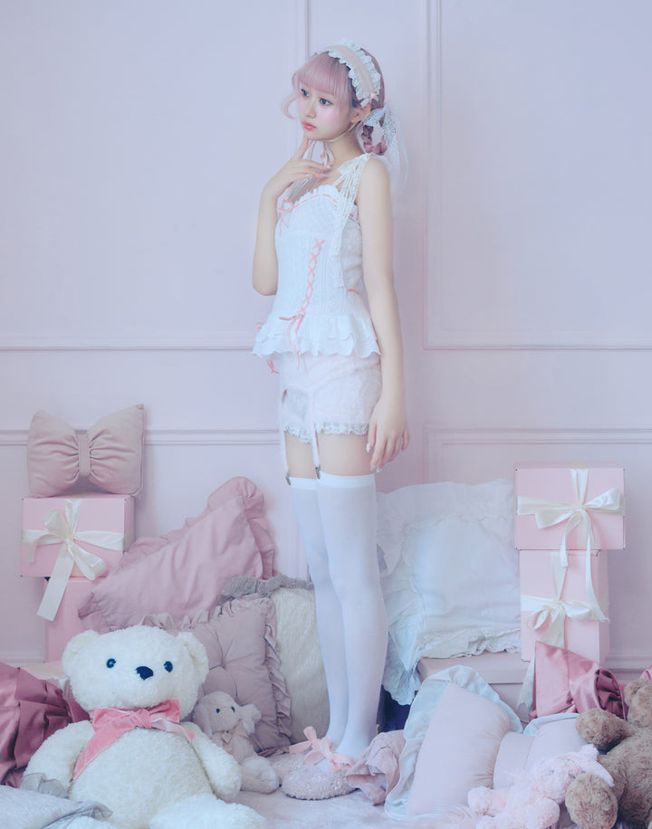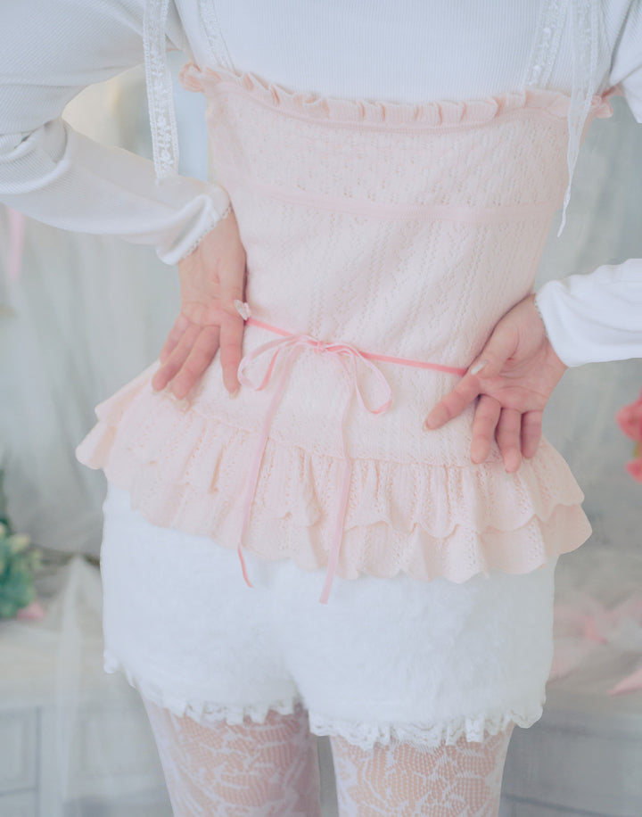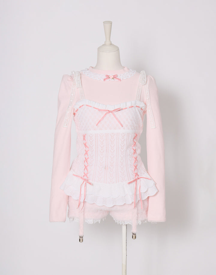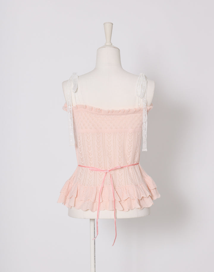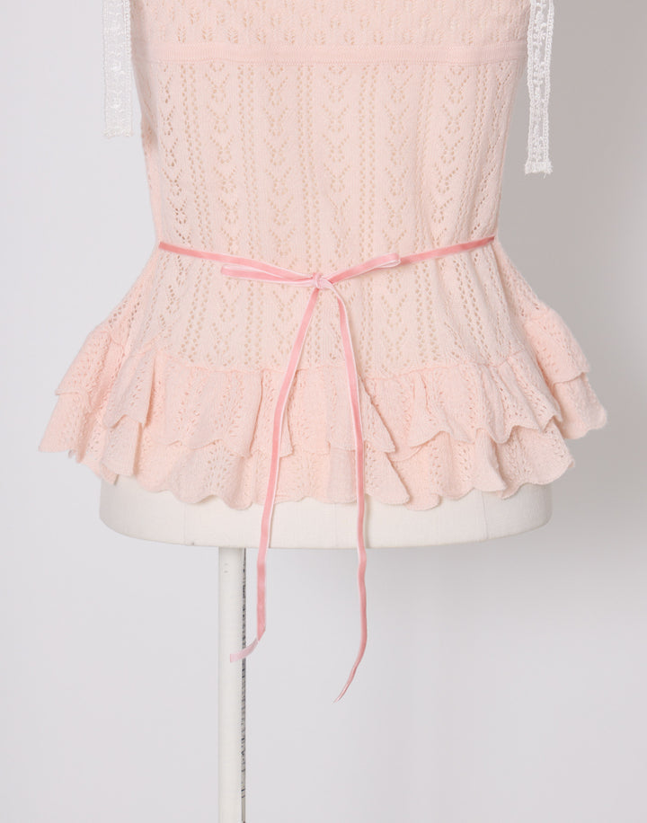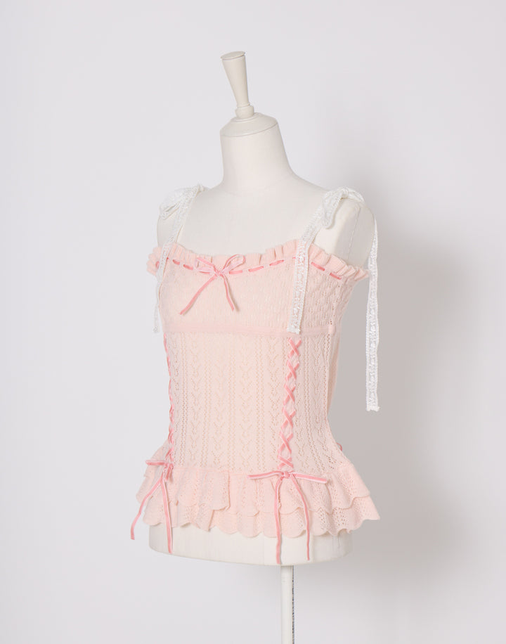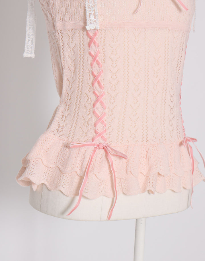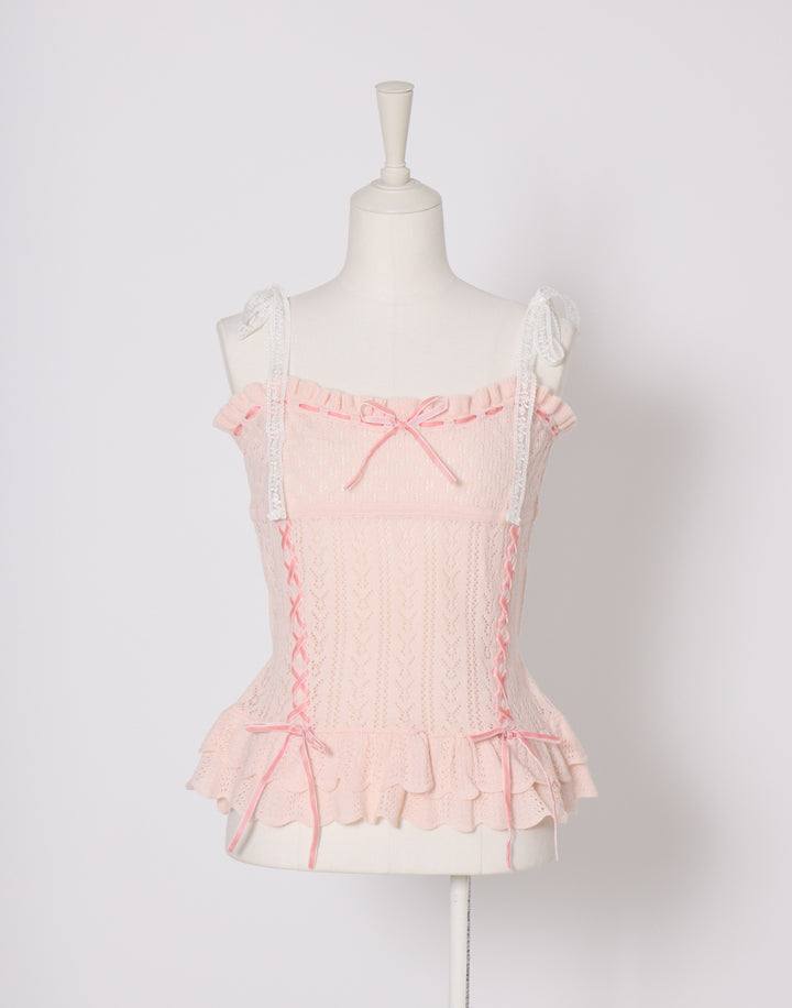 繊細な編地に添えたレースアップがポイント。肩のリボンはお好きな長さに調節できます。