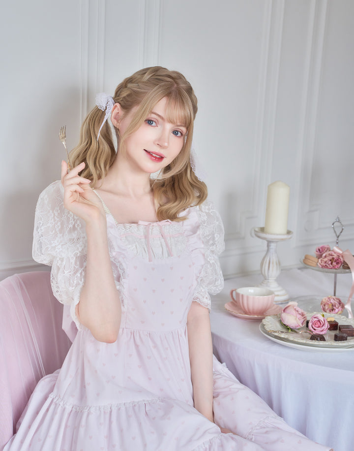人気のドッキング風デザインのワンピースをキュートなハートドット柄でお作りしました。ドットの中にはさりげなく「mellfy」のロゴが添えられています。インナーチュールでふんわり広がるシルエットと上品な丈感がクラシカルなガーリームードを演出してくれます。