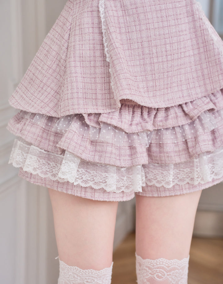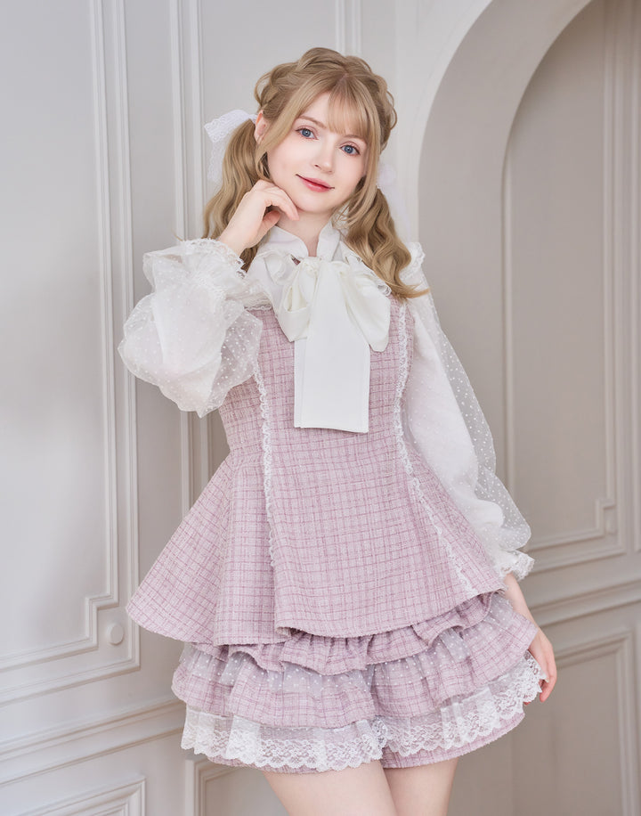 ツイード生地を使用したセットアップアイテム。ドットチュールやレース、バックのレースアップリボンなど、ディテールにこだわったメルメモらしいセットアップです。トップスは背中のレースアップでサイズ調整が可能です。ボトムはショートパンツになっており、ウエストは総ゴム仕様です。セットアップとしてはもちろん、単体でも着やすいデザインになっています。