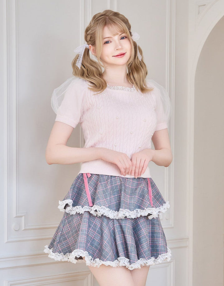 サイドにベロアリボンをあしらったチェック柄のティアードスカート。グレーには甘さを感じるベリーピンクを、ピンクには秋らしいこっくりブラウンを配色にして印象の違う二色をご用意しました。高めのウエストマークで脚長効果にも期待できます。