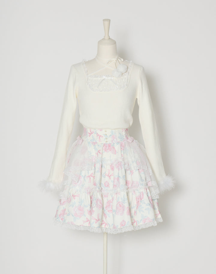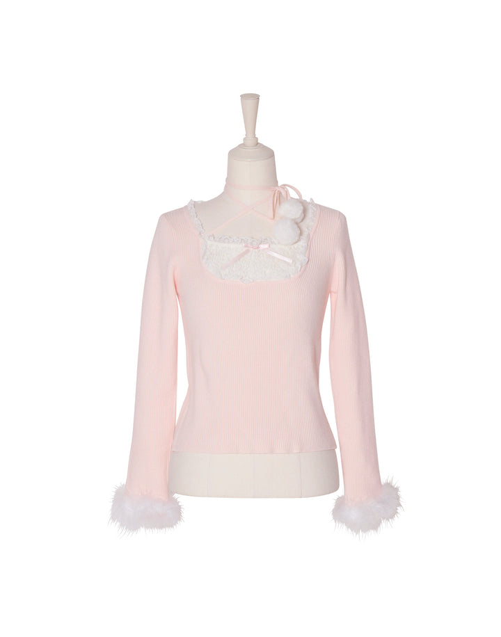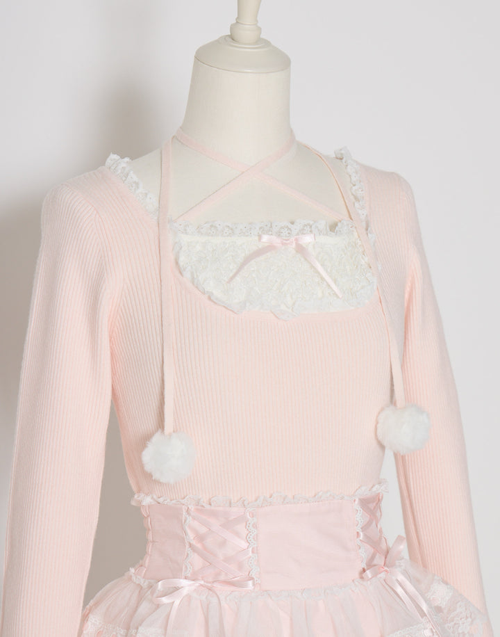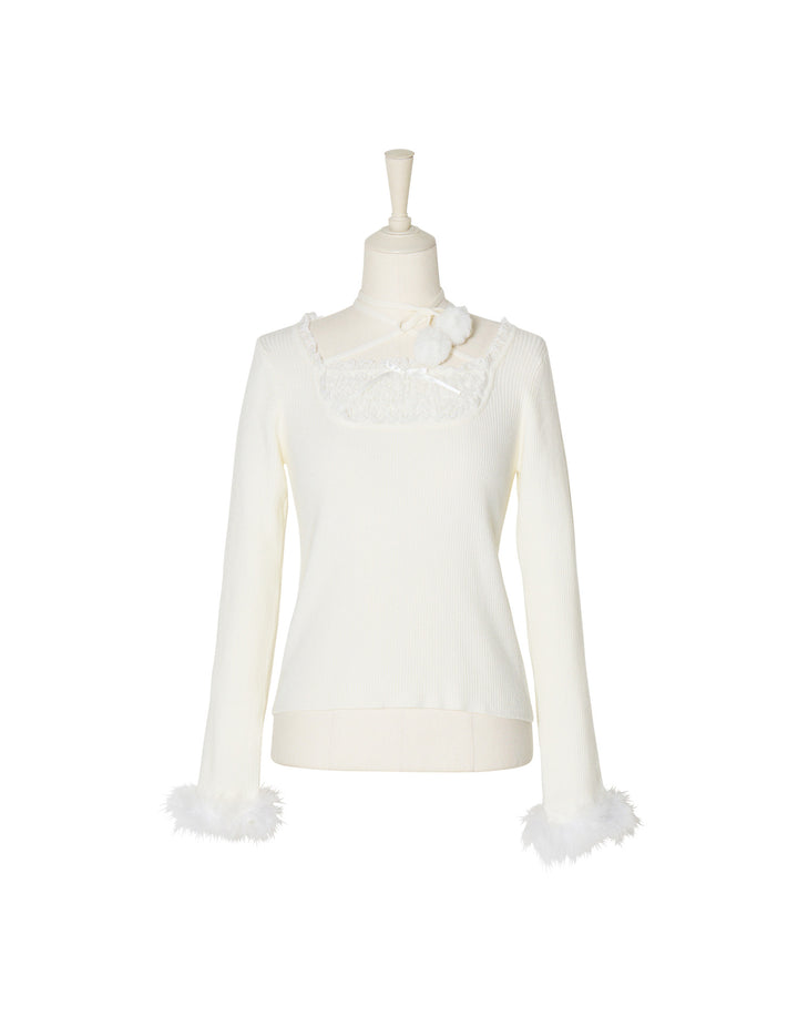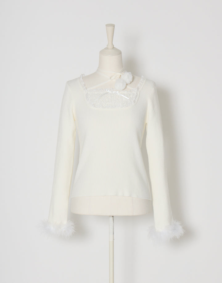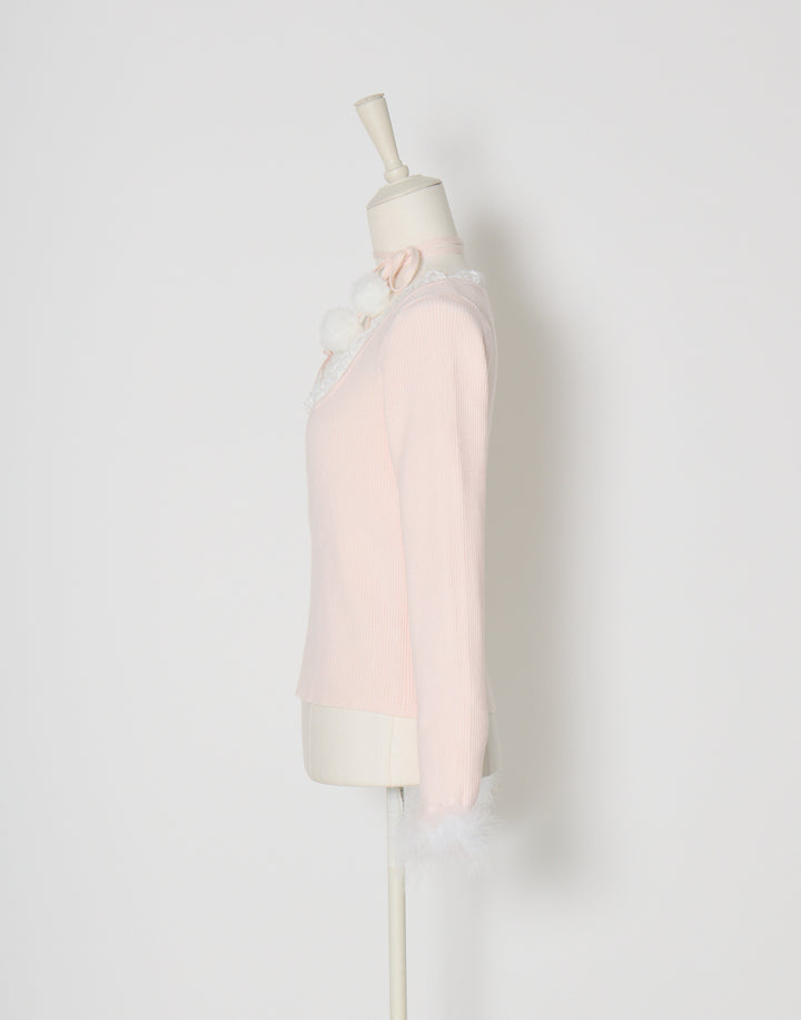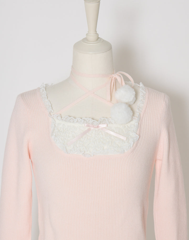 細やかなレースのフリルをフロントに施したニット。胸元から続くポンポンは首元をお好きにデコレーションできます。