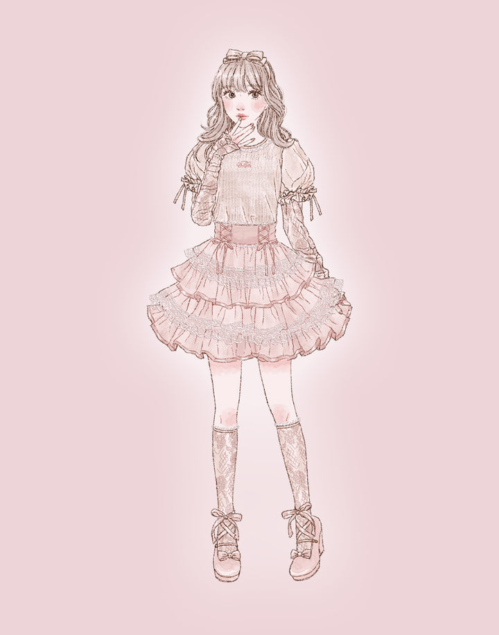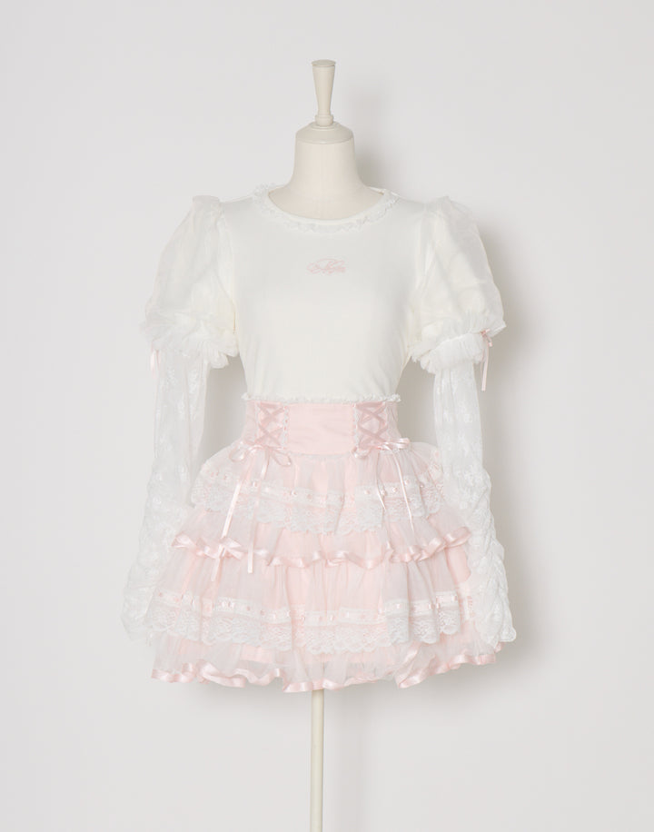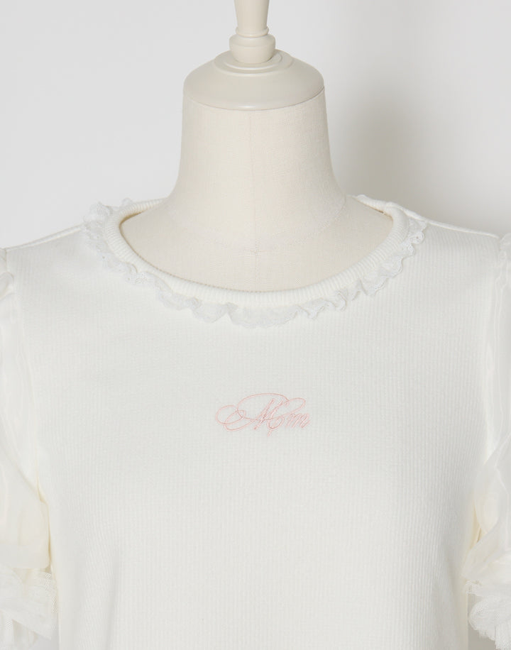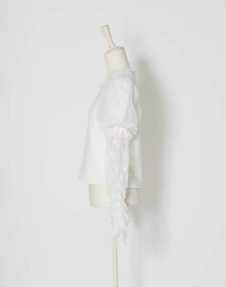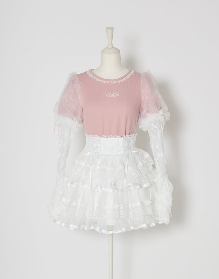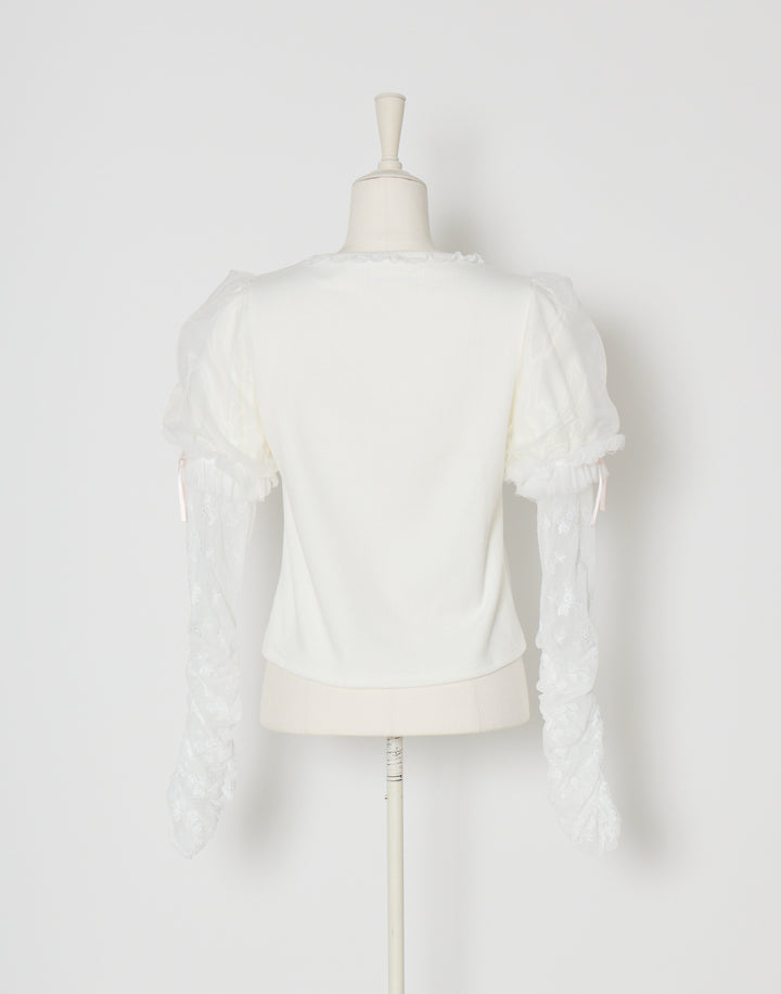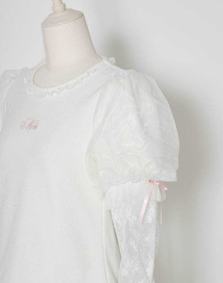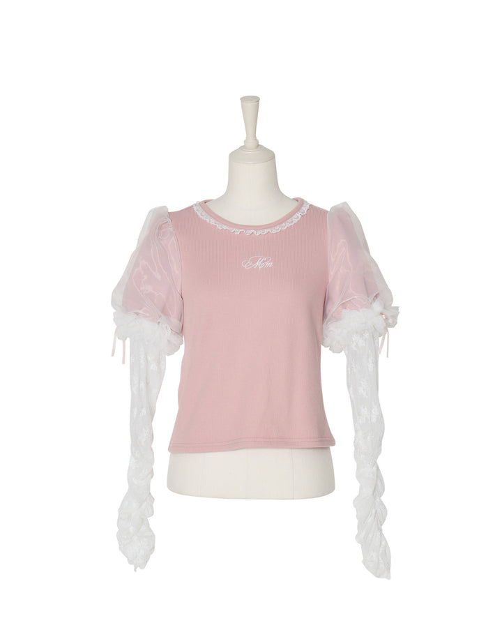 伸縮性のある着心地の良いニットを使用しています。パフスリーブの袖口にはソフトチュールを寄せてリボンをトッピング。