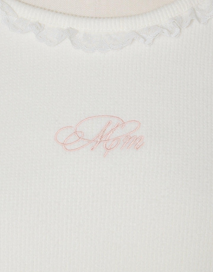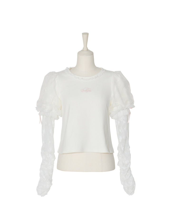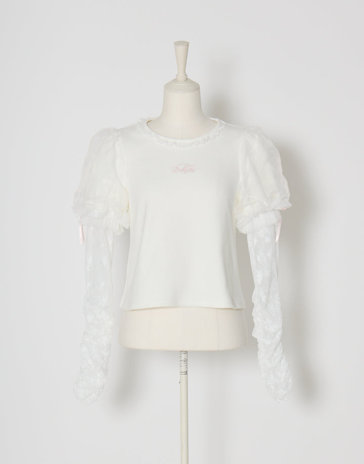 透け感のあるレースの袖とフロントのロゴ刺繍で特別な一枚に。