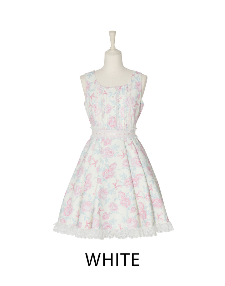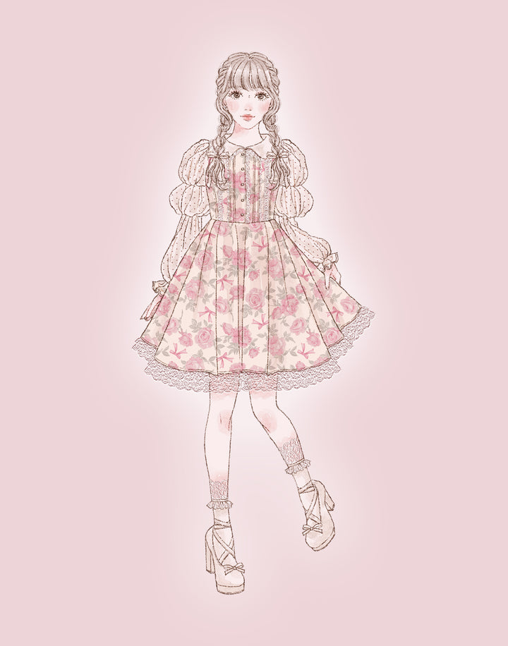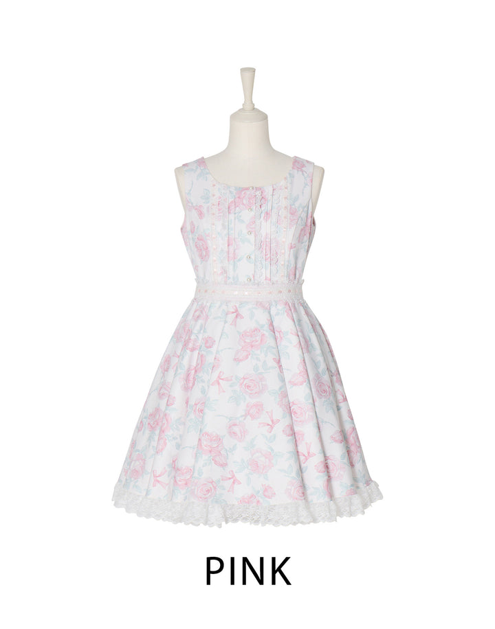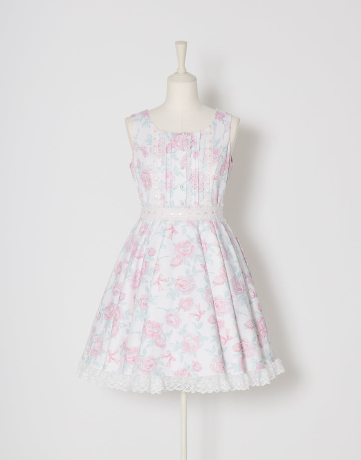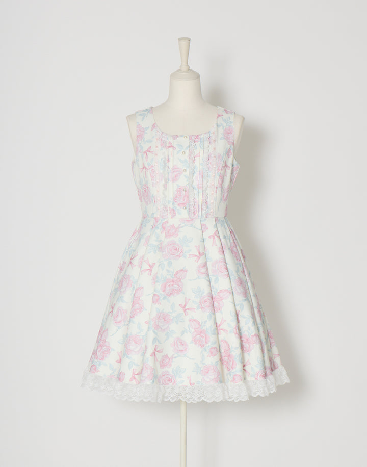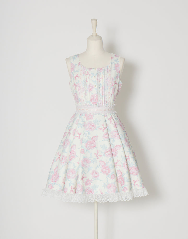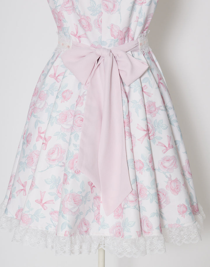 オリジナルの薔薇とリボン柄をプリントしたワンピース。フロントのピンタックやはしごレースの細やかなディテールにこだわり、取り外し可能なウエストリボンでスタイルアップも叶えられます。