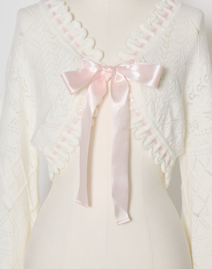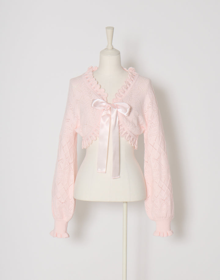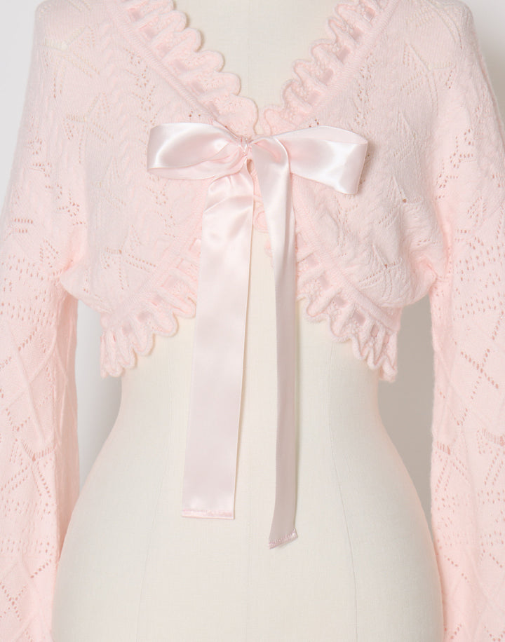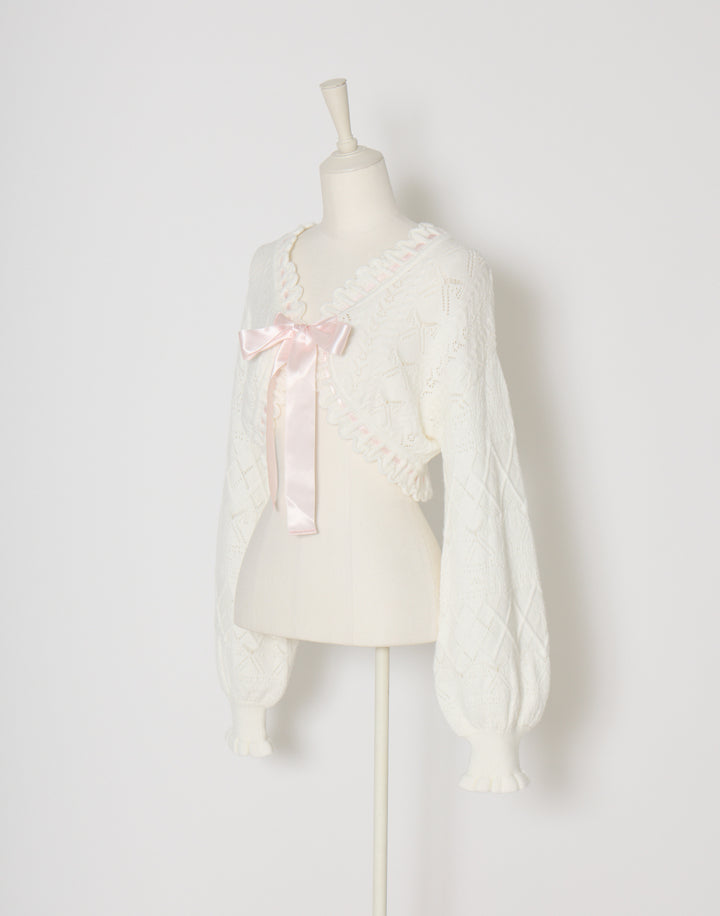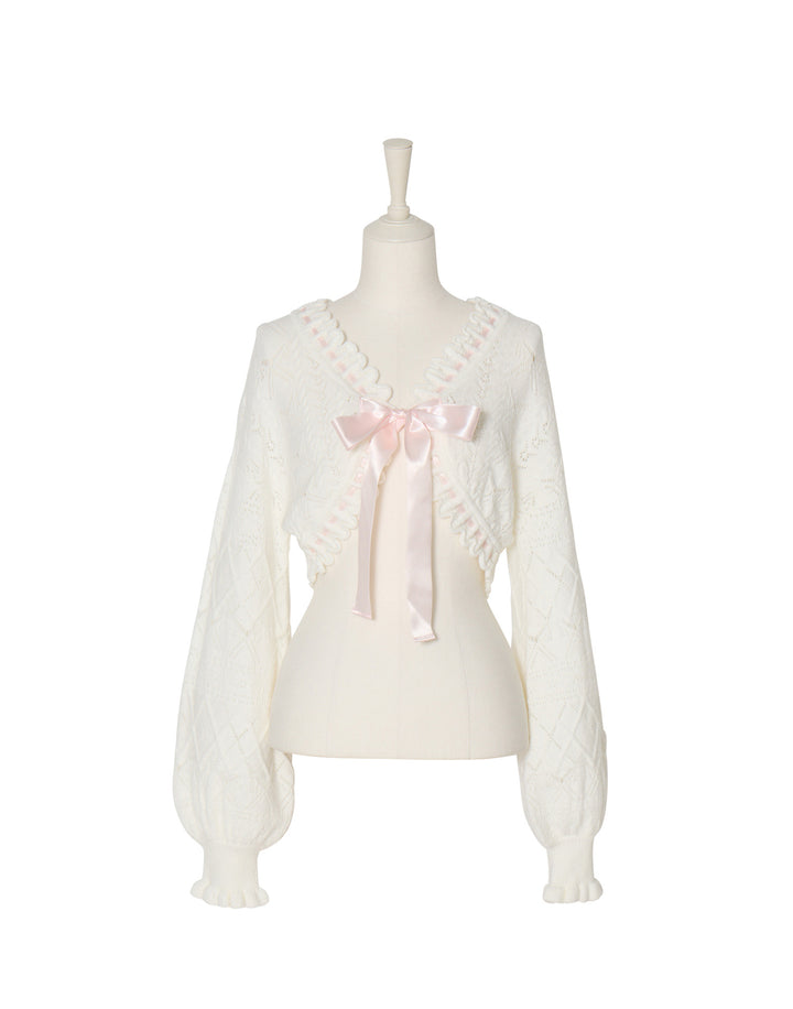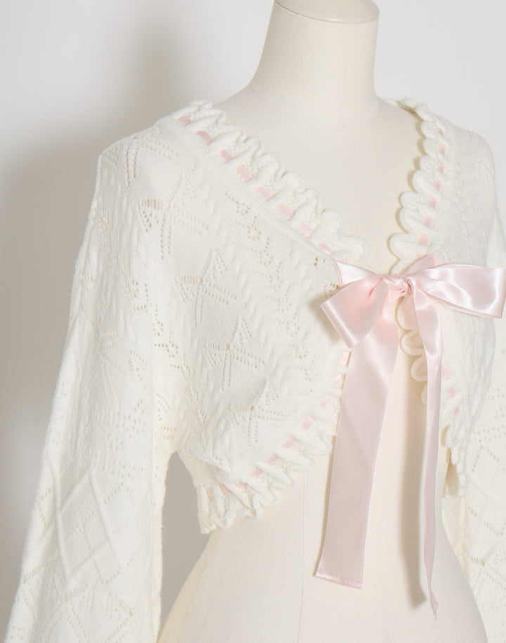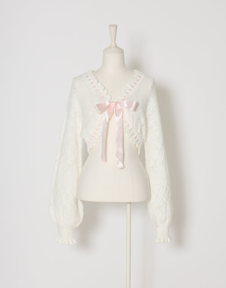 リボン柄の編地を使用したショート丈のニットボレロ。