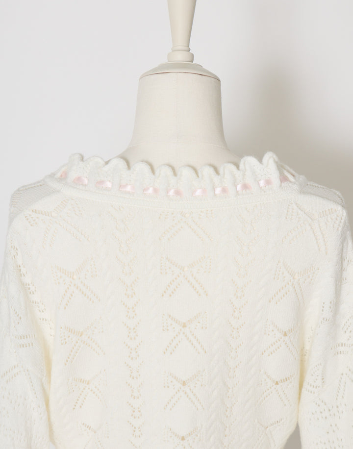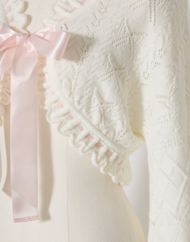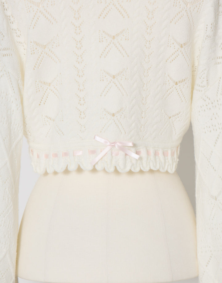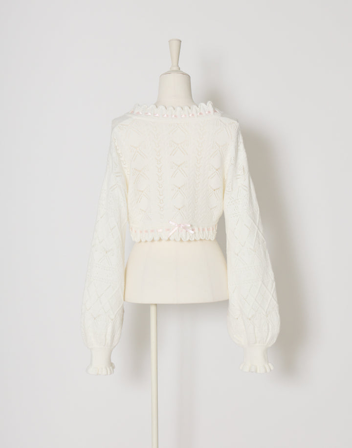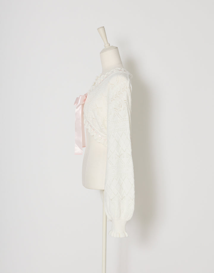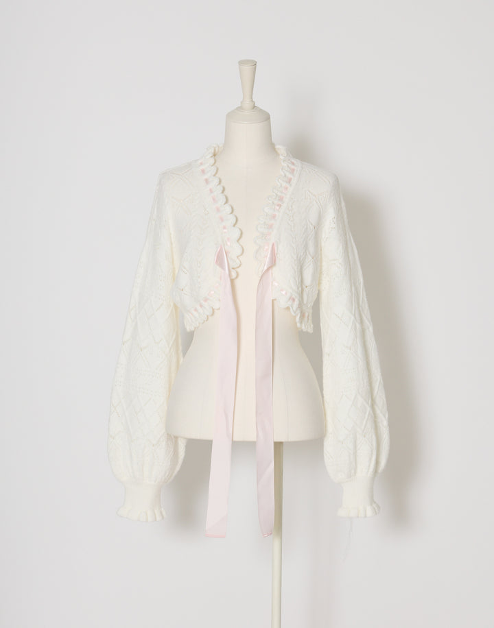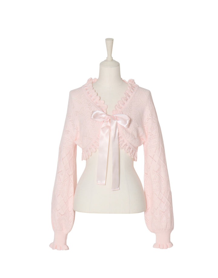 リボン柄の編地を使用したショート丈のニットボレロ。