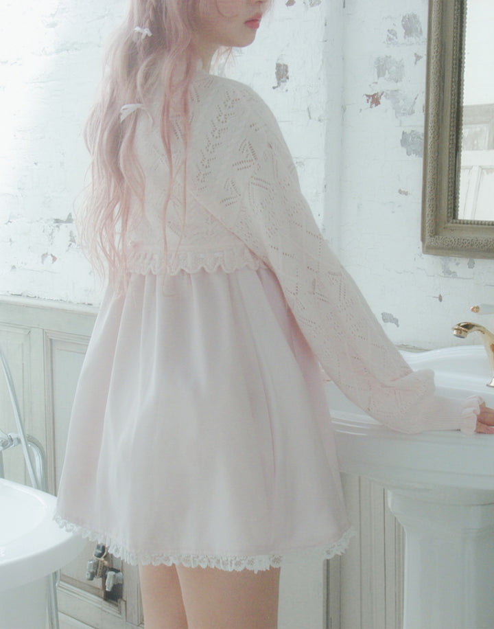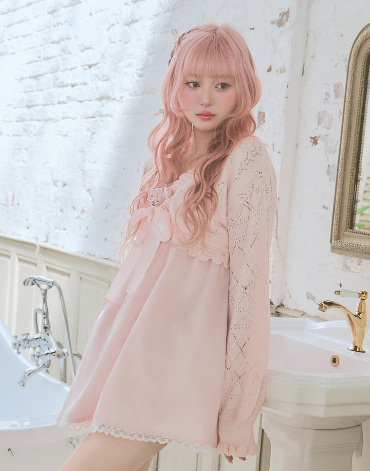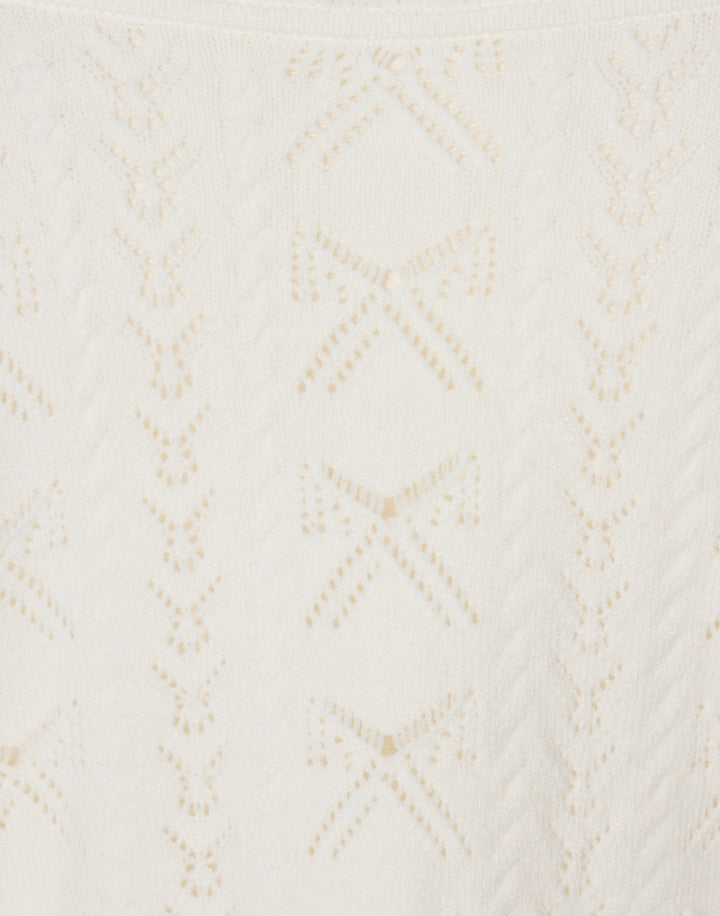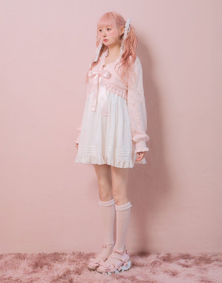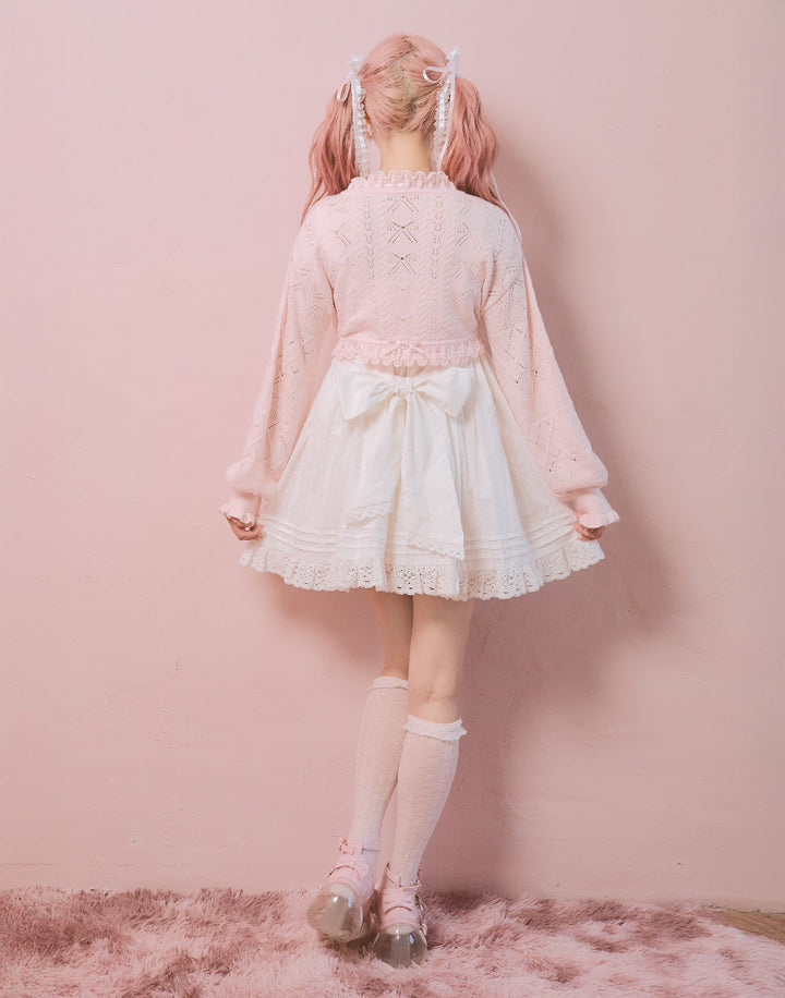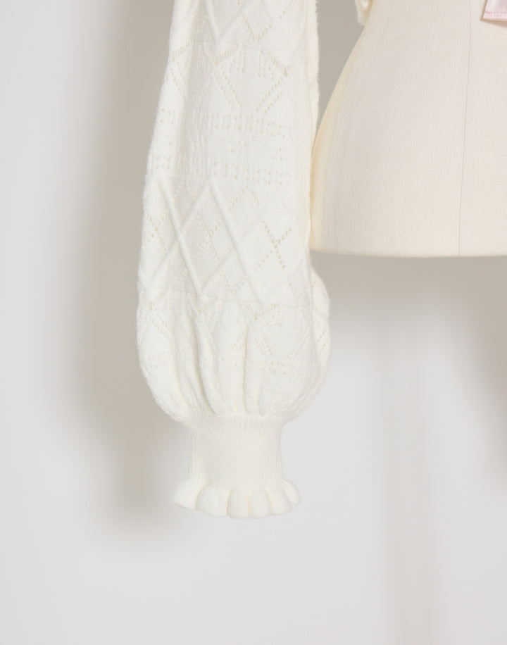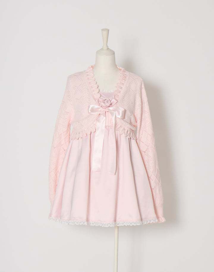 リボン柄の編地を使用したショート丈のニットボレロ。