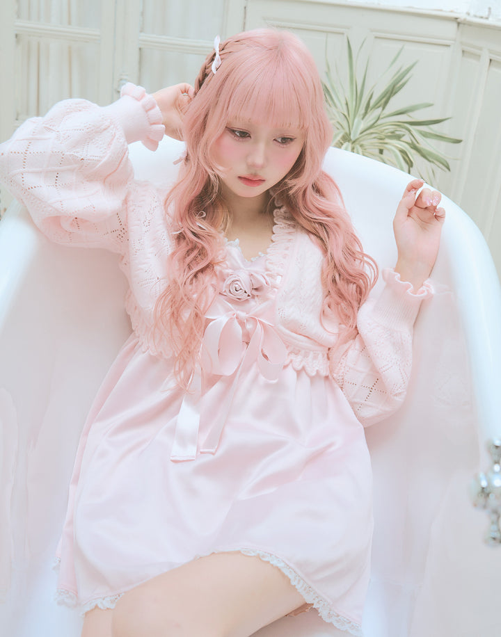 フリルのトリミングやフロントの上品なリボンがポイントで、お袖はふわっとボリュームのあるシルエットに。