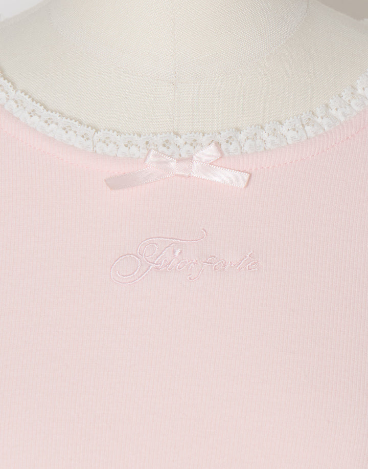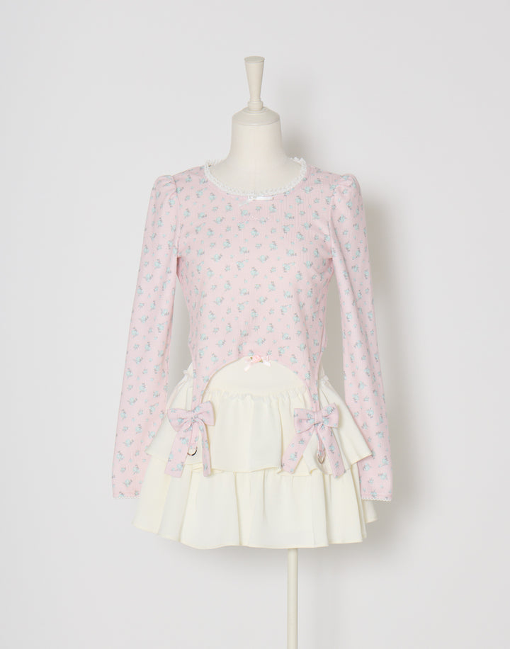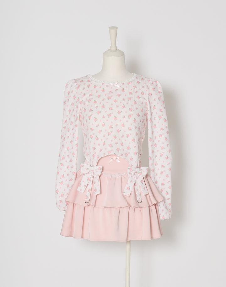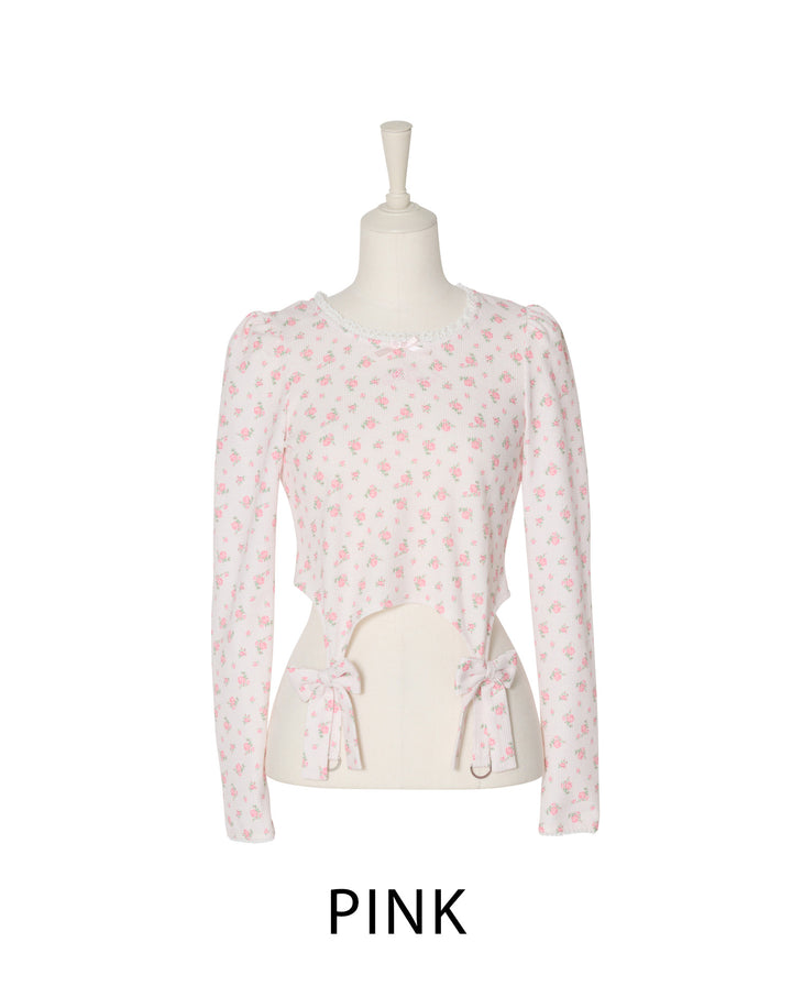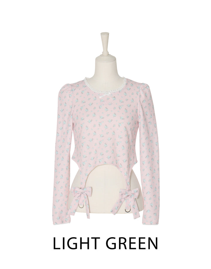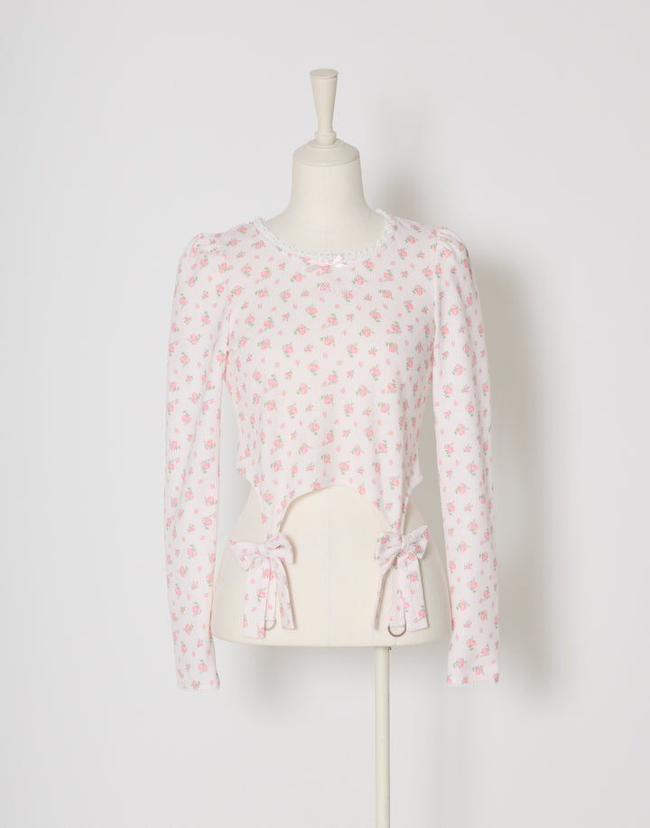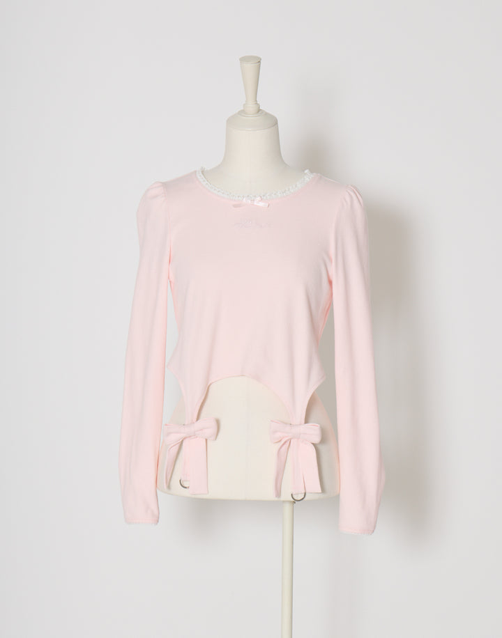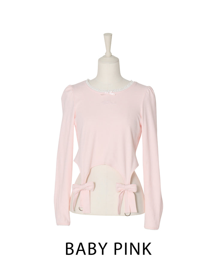 ワッフル素材の着心地軽やかなトップス。ガーター風デザインがコーディネートのアクセントになります。存在感のある裾の同素材のリボンは取り外し可能です。