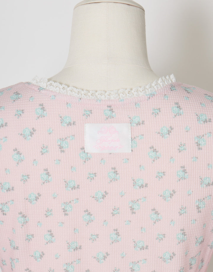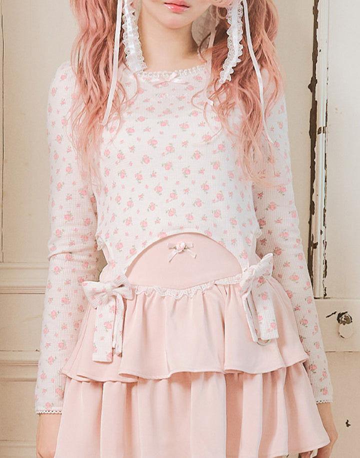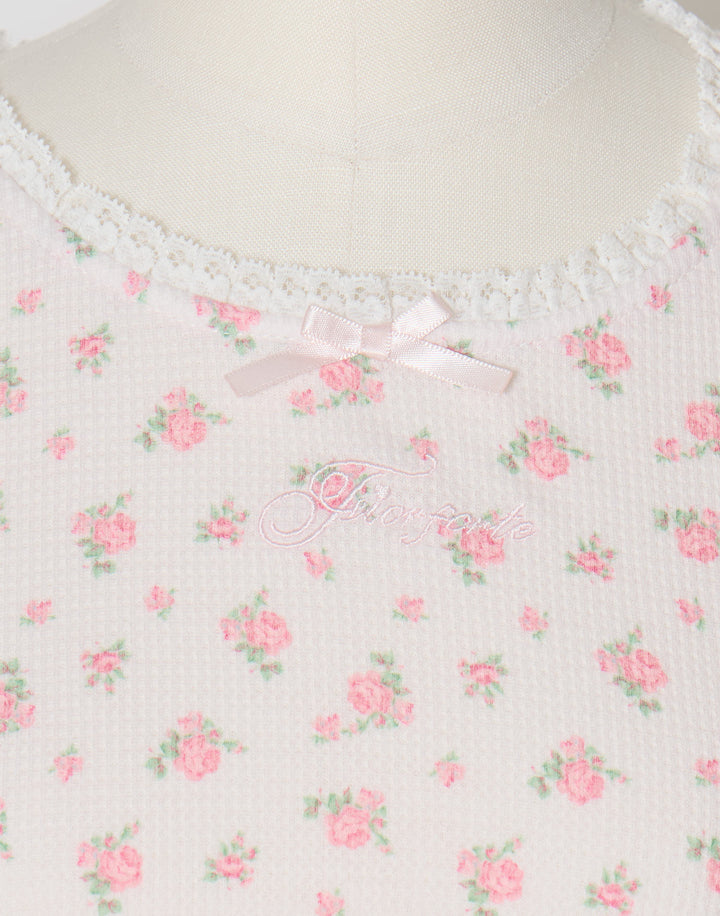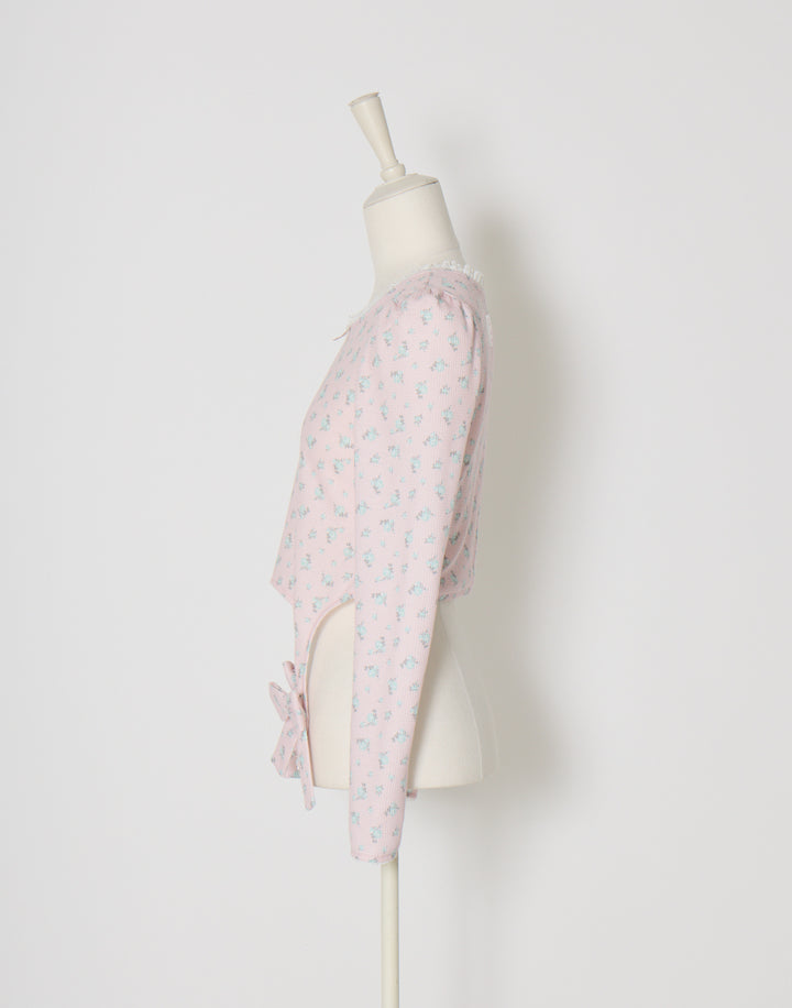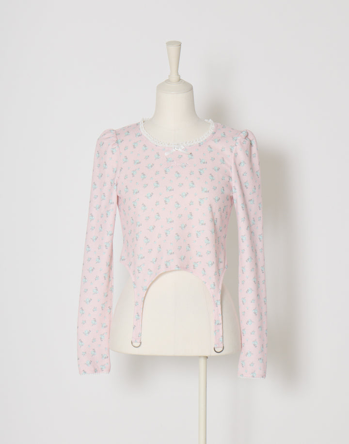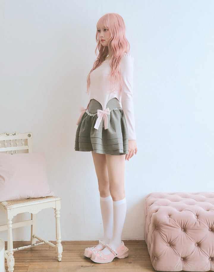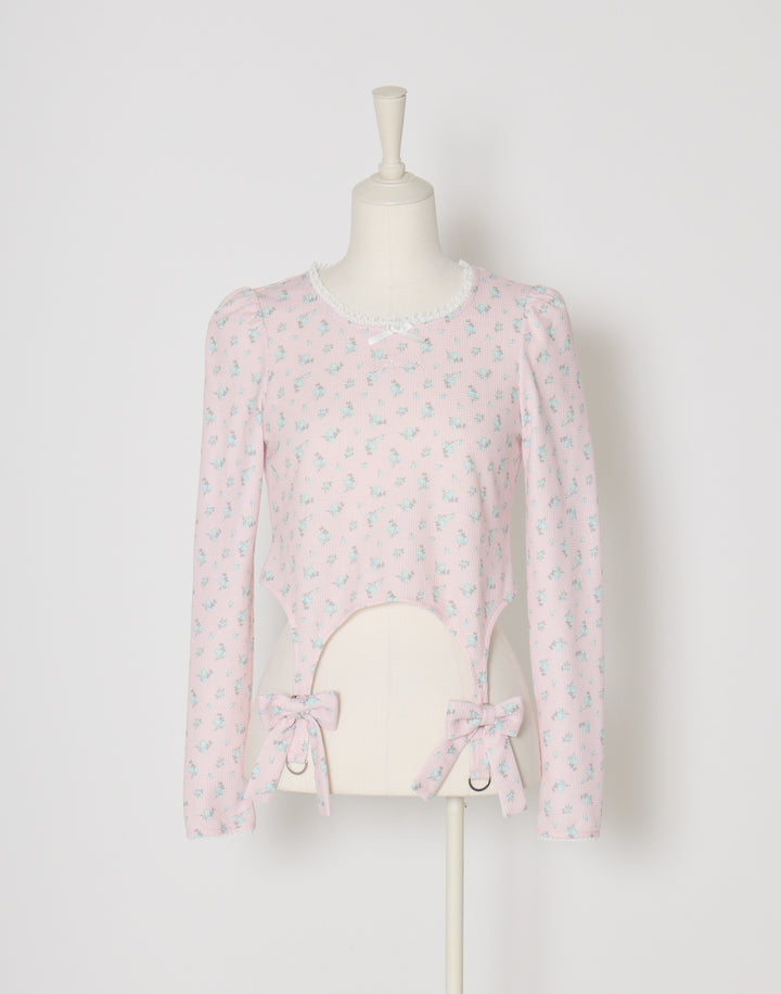 ワッフル素材の着心地軽やかなトップス。ガーター風デザインがコーディネートのアクセントになります。存在感のある裾の同素材のリボンは取り外し可能です。