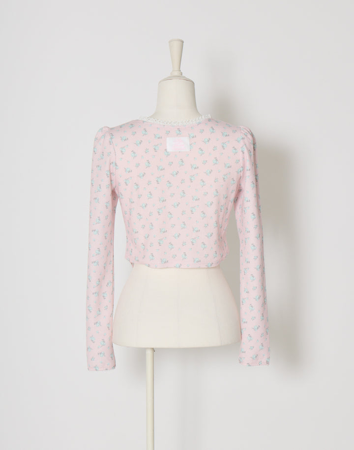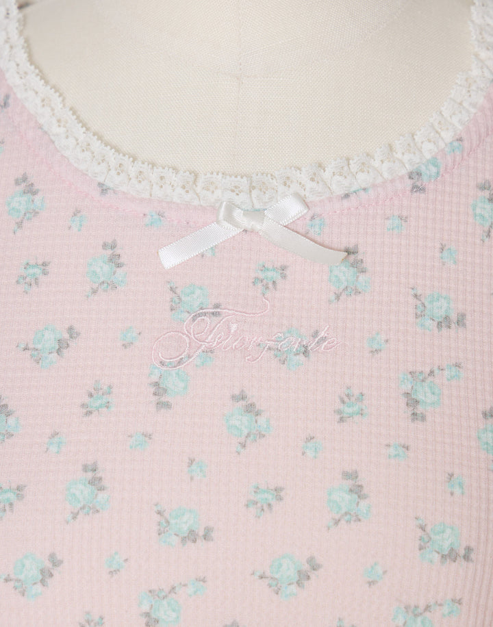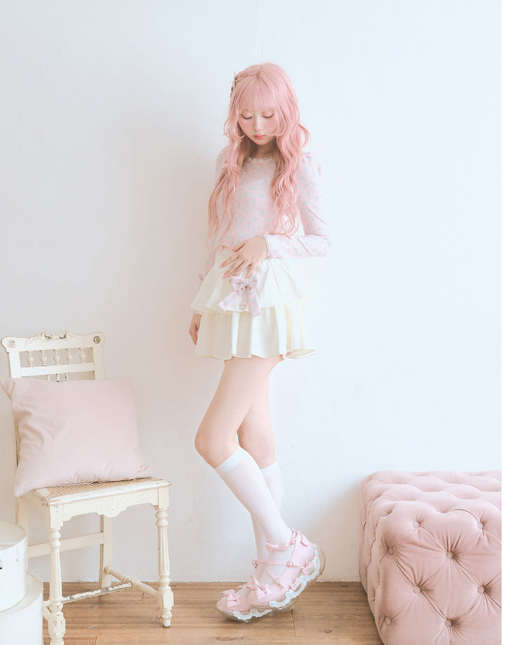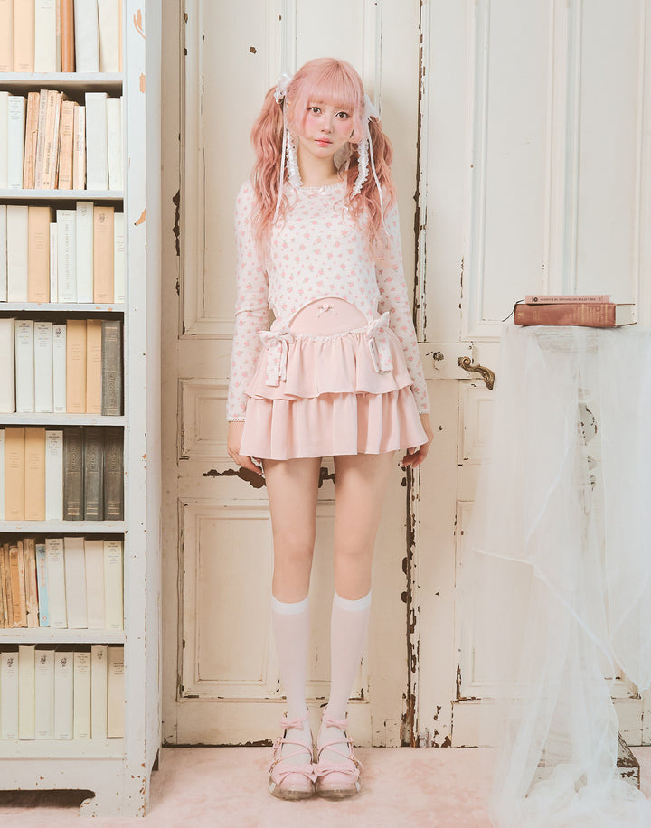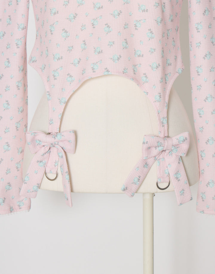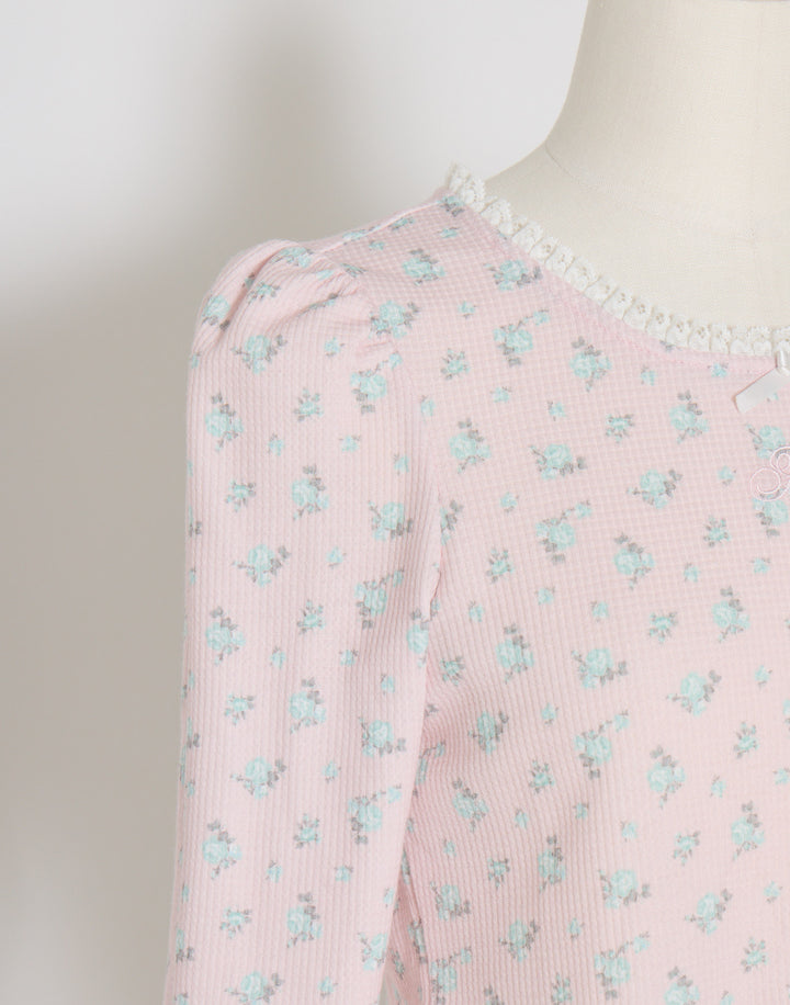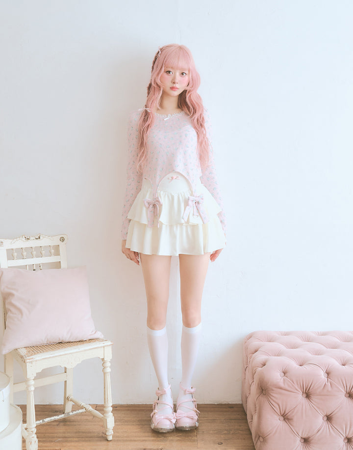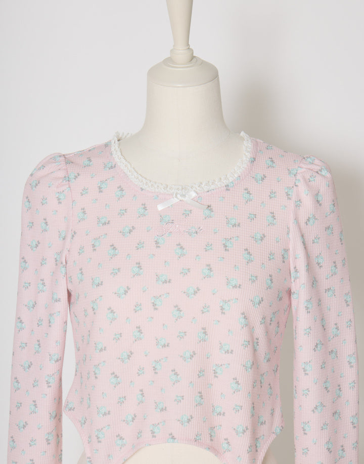 ワッフル素材の着心地軽やかなトップス。ガーター風デザインがコーディネートのアクセントになります。存在感のある裾の同素材のリボンは取り外し可能です。