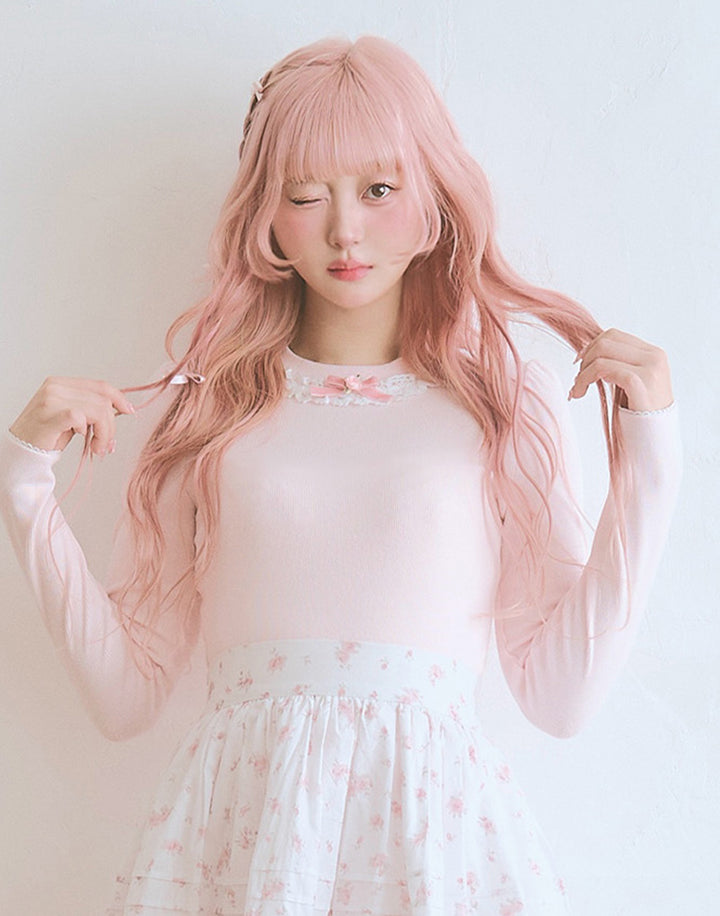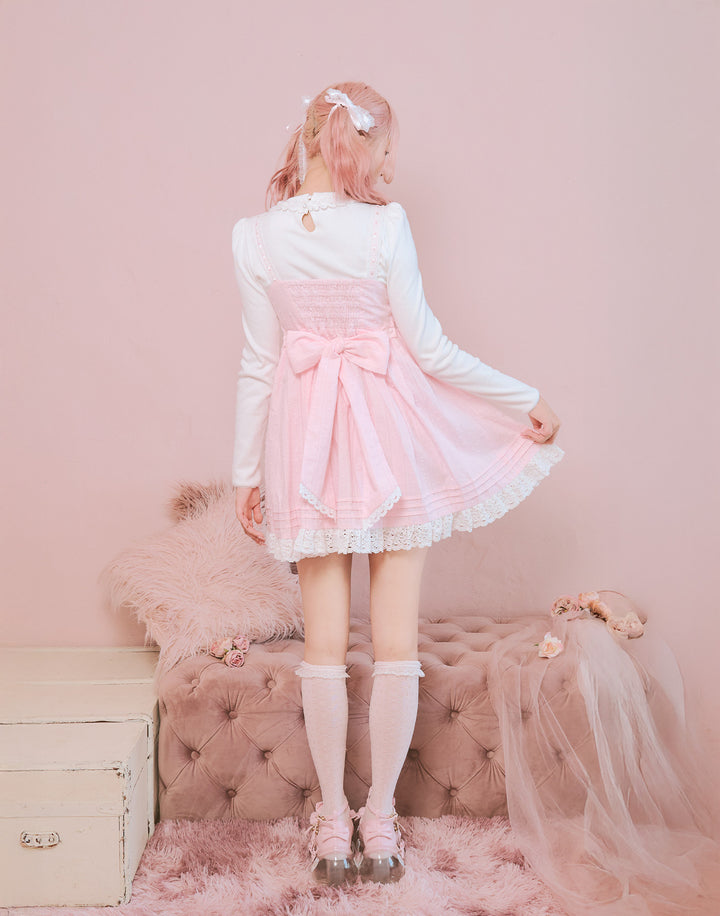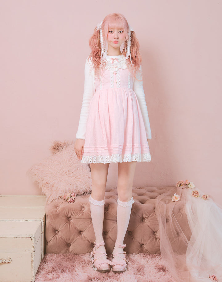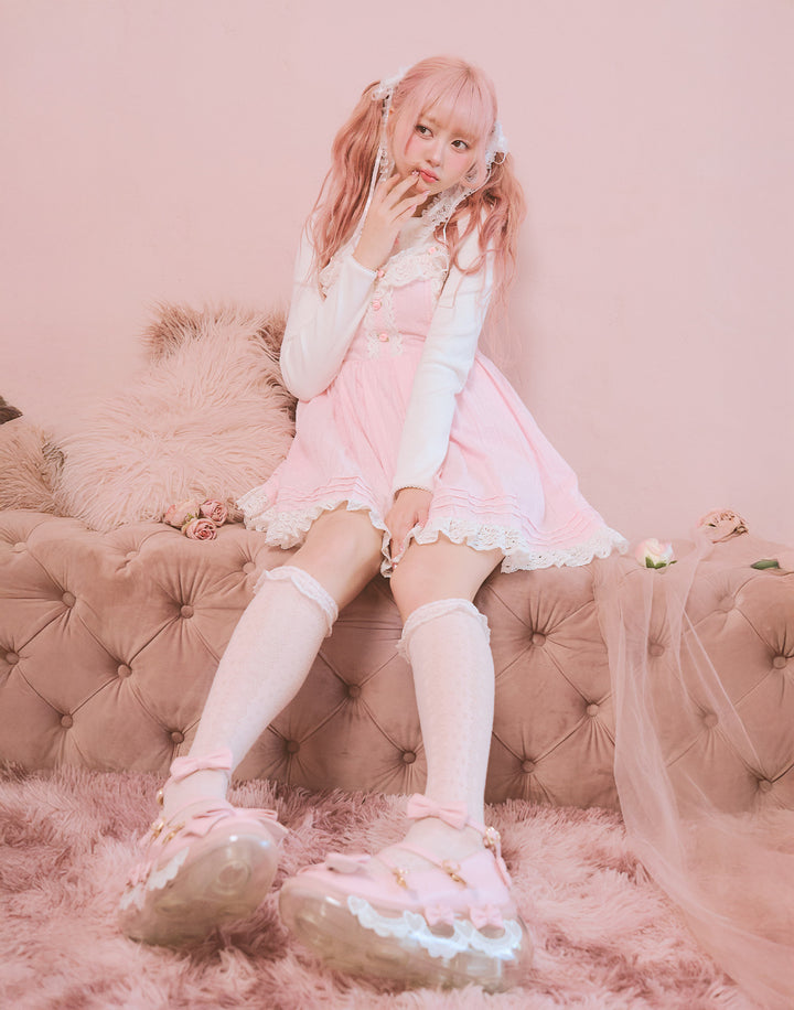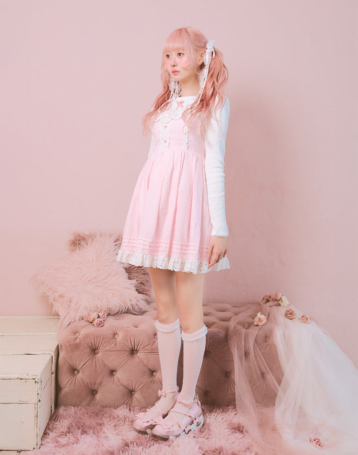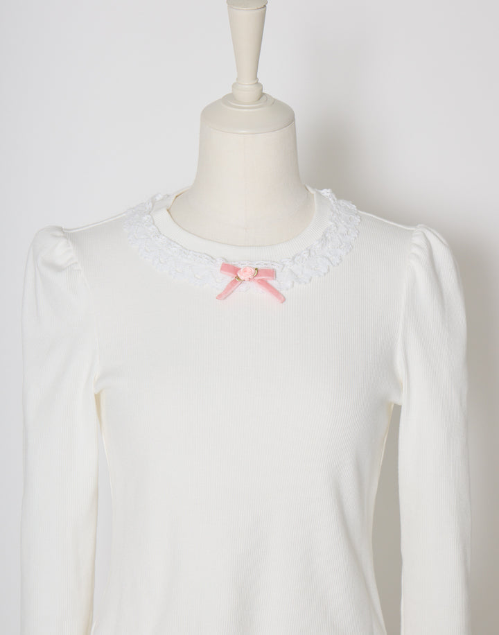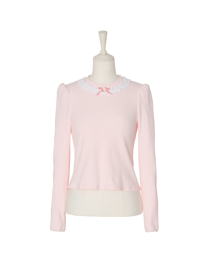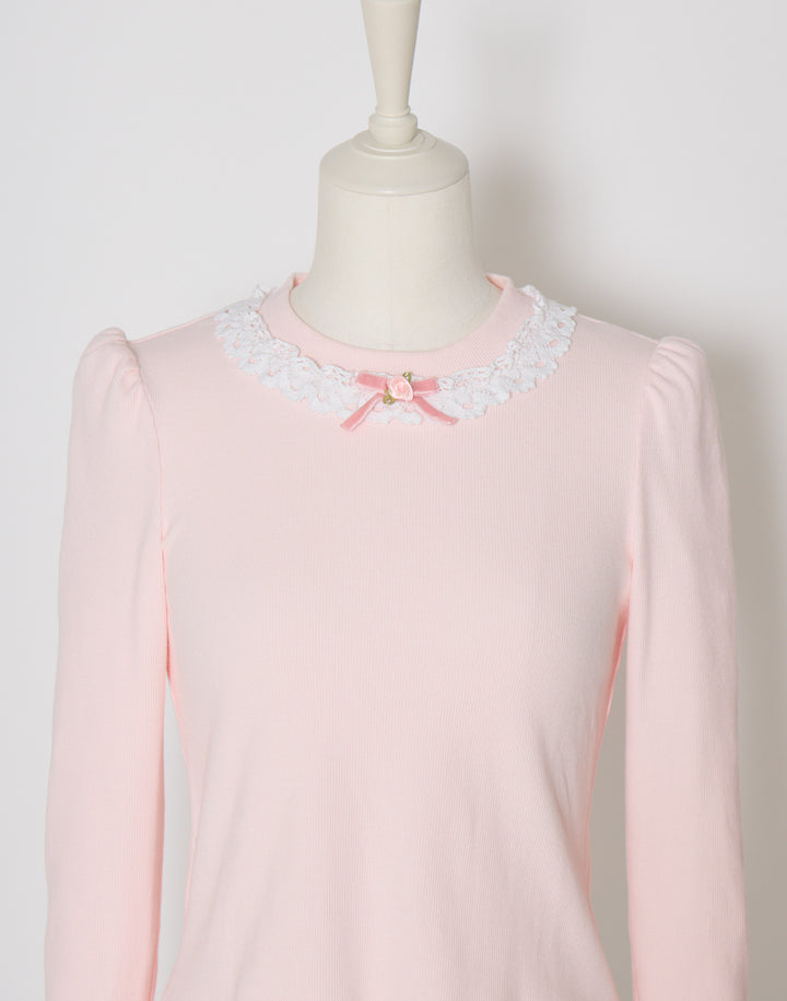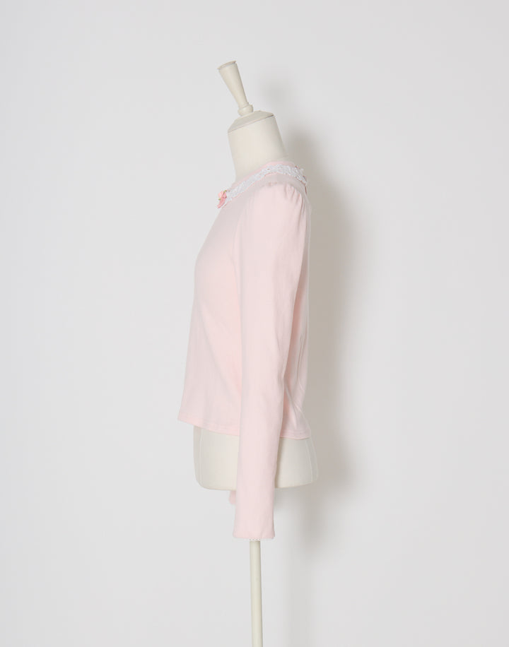 襟元にはさりげないプチローズとレースをあしらっています。