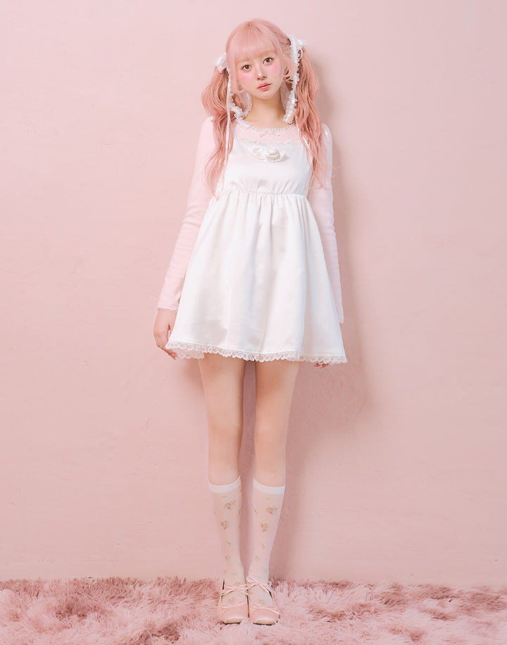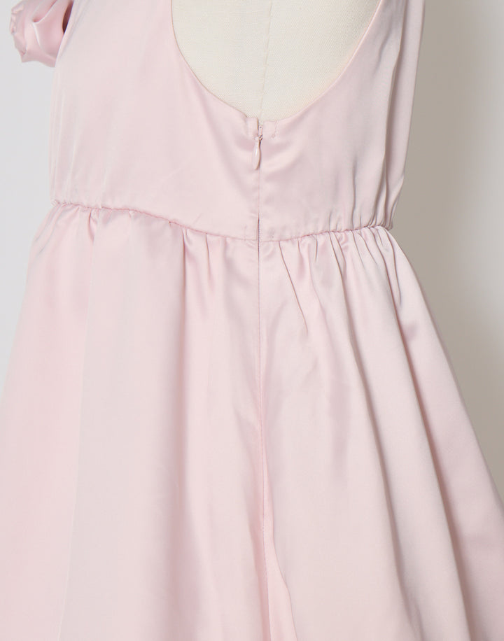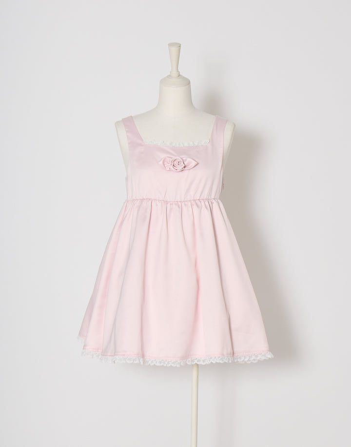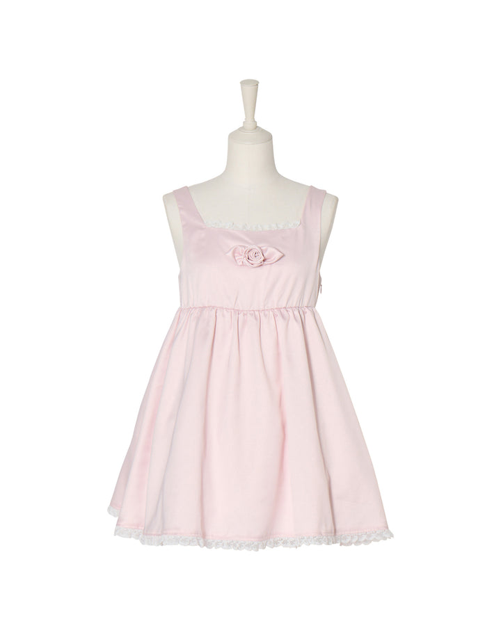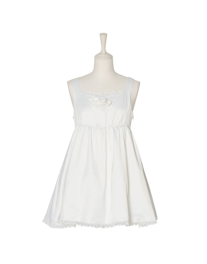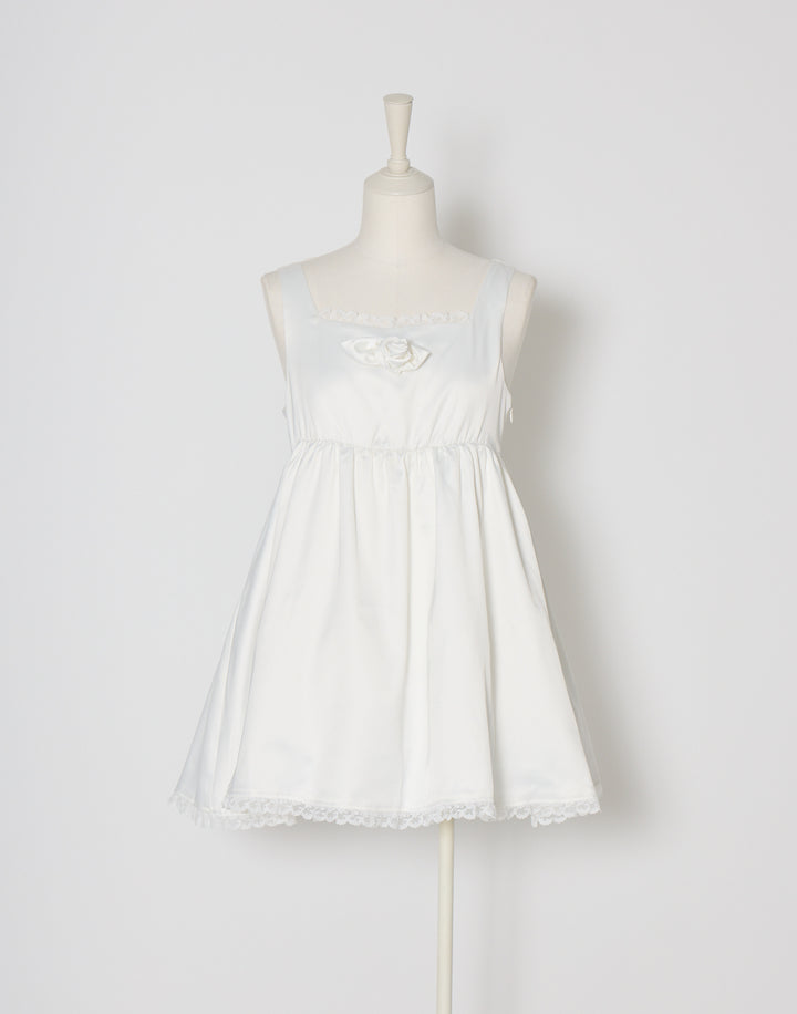 胸元のサテン生地で作り上げた立体の薔薇が目を引くミニワンピース。ウエストとバック部分にはゴムを使用していて着心地にこだわっています。