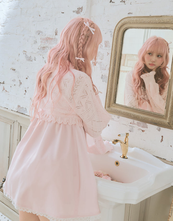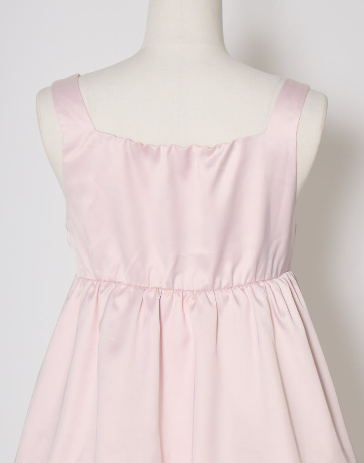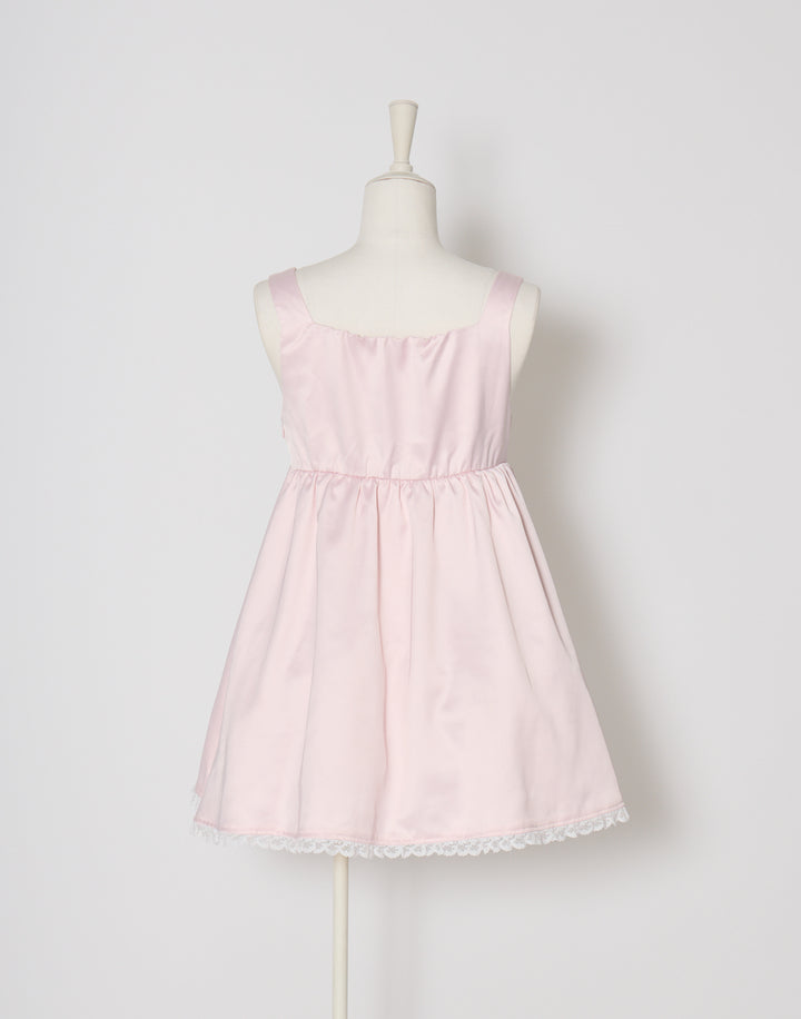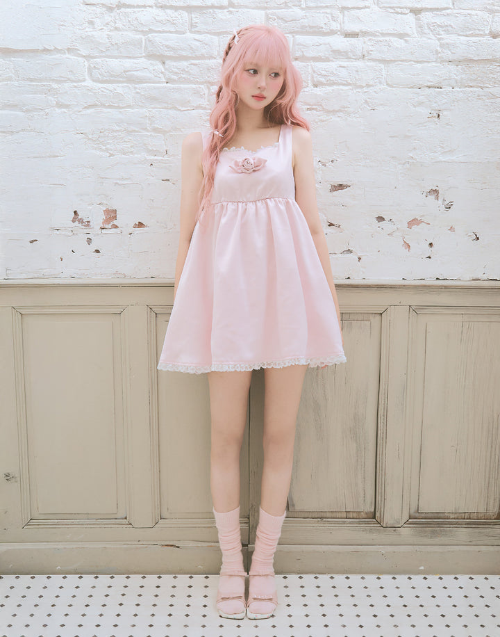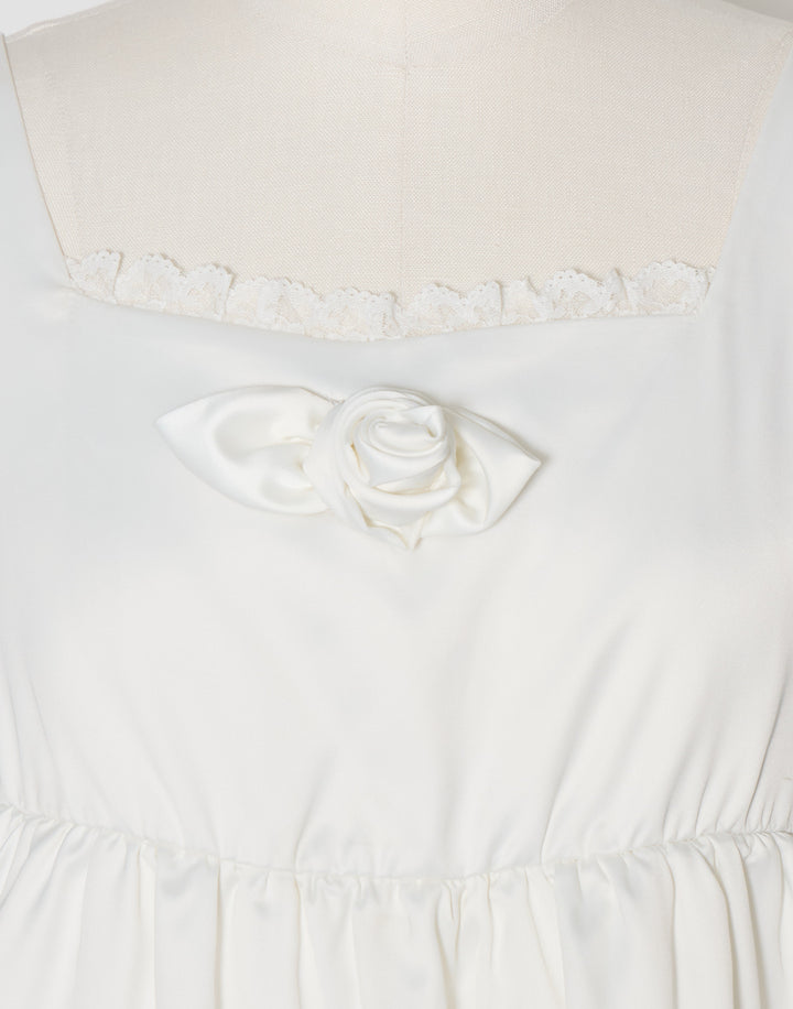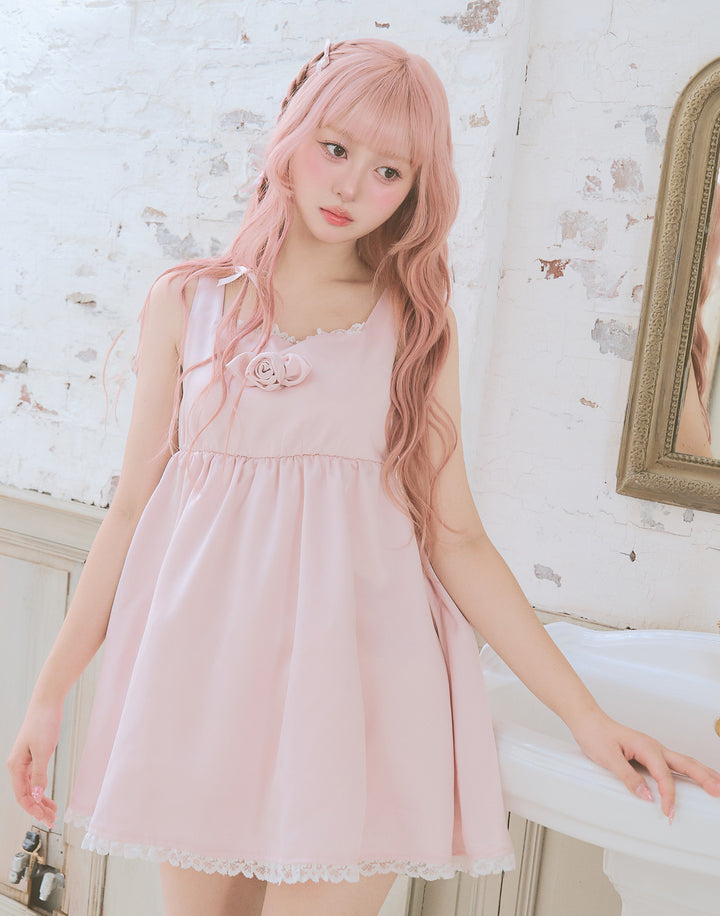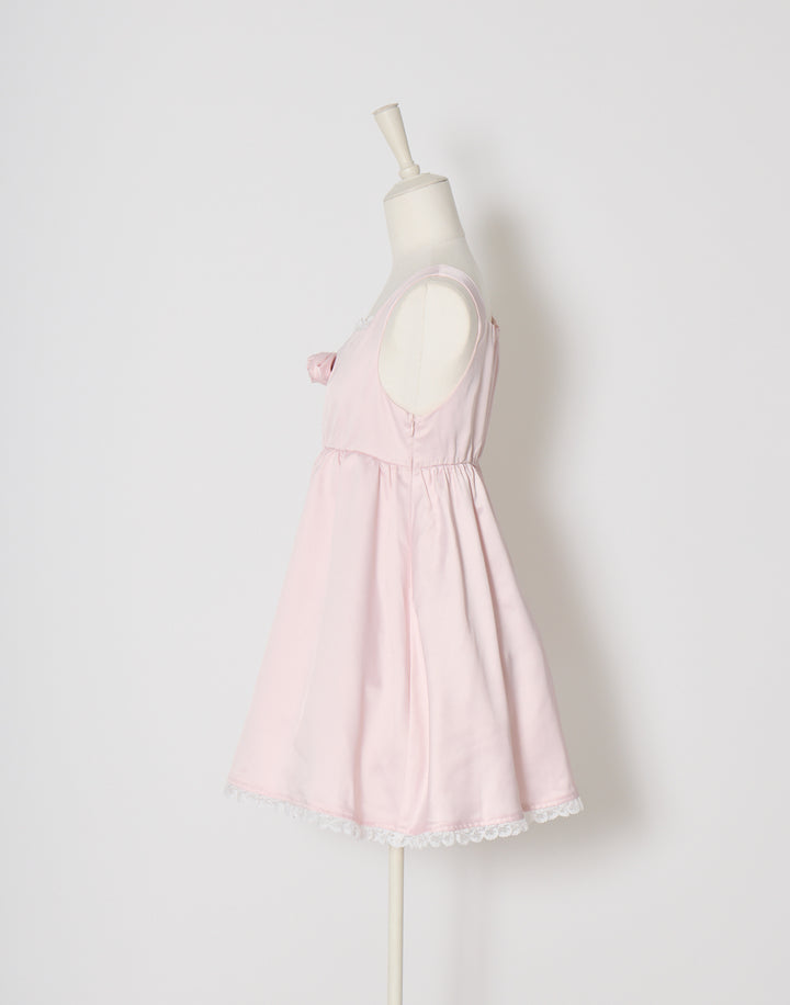 胸元のサテン生地で作り上げた立体の薔薇が目を引くミニワンピース。ウエストとバック部分にはゴムを使用していて着心地にこだわっています。