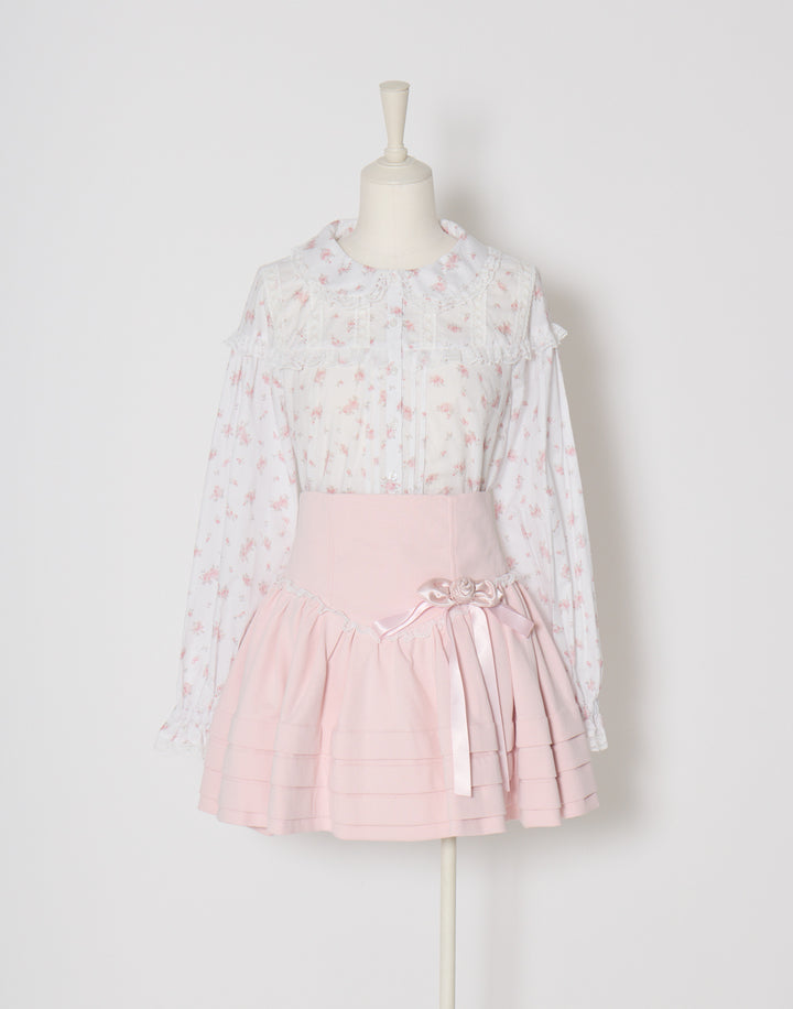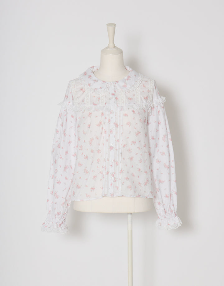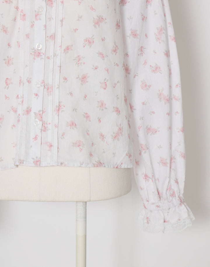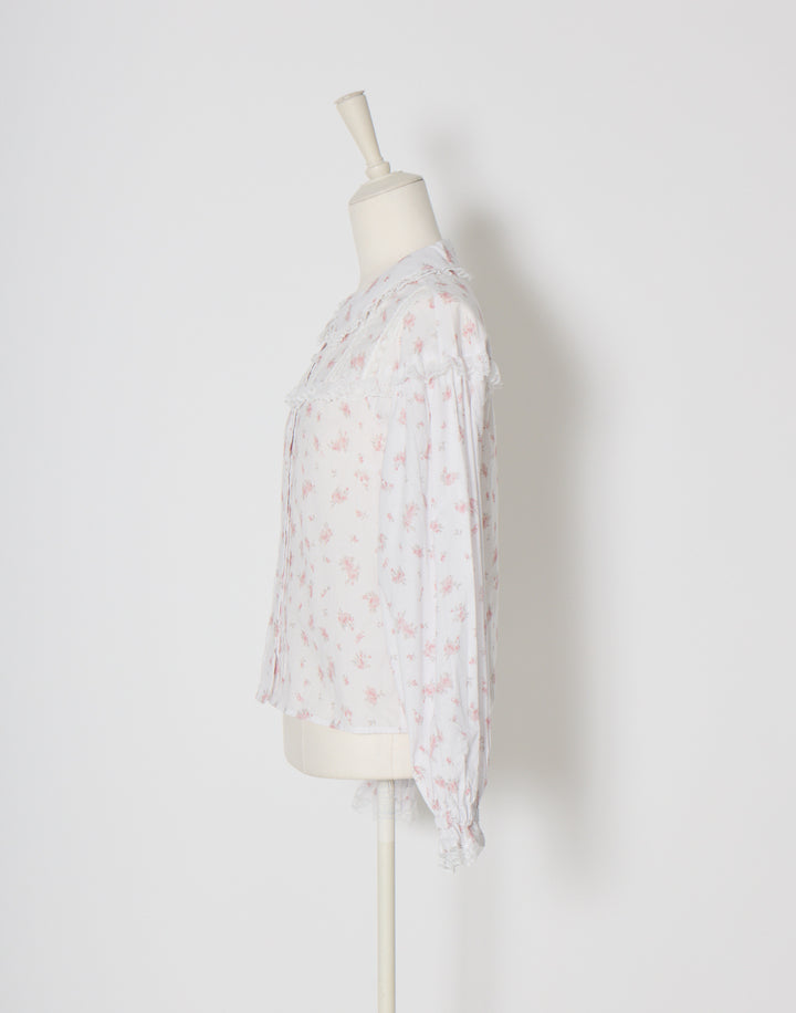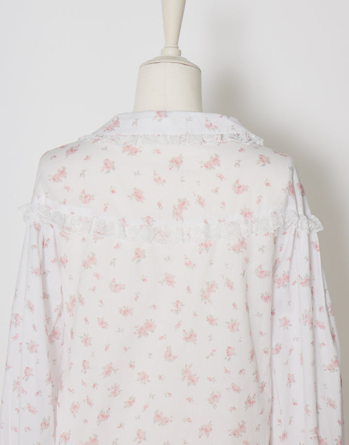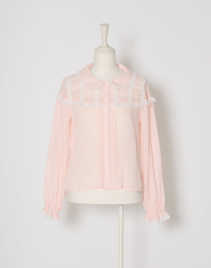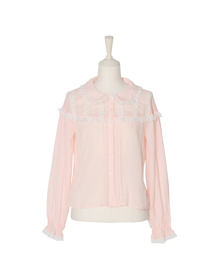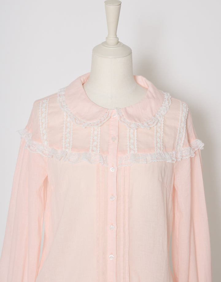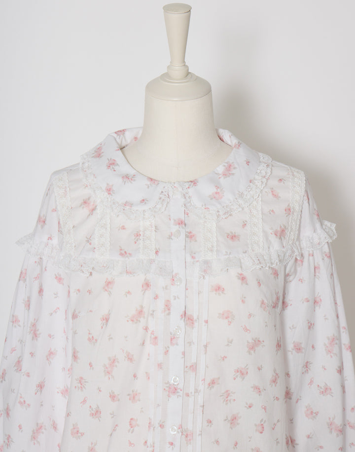 フロントは繊細なピンタックとレースで華やかに、袖口にはゴムを使用し着心地の良さにこだわったデザイン。