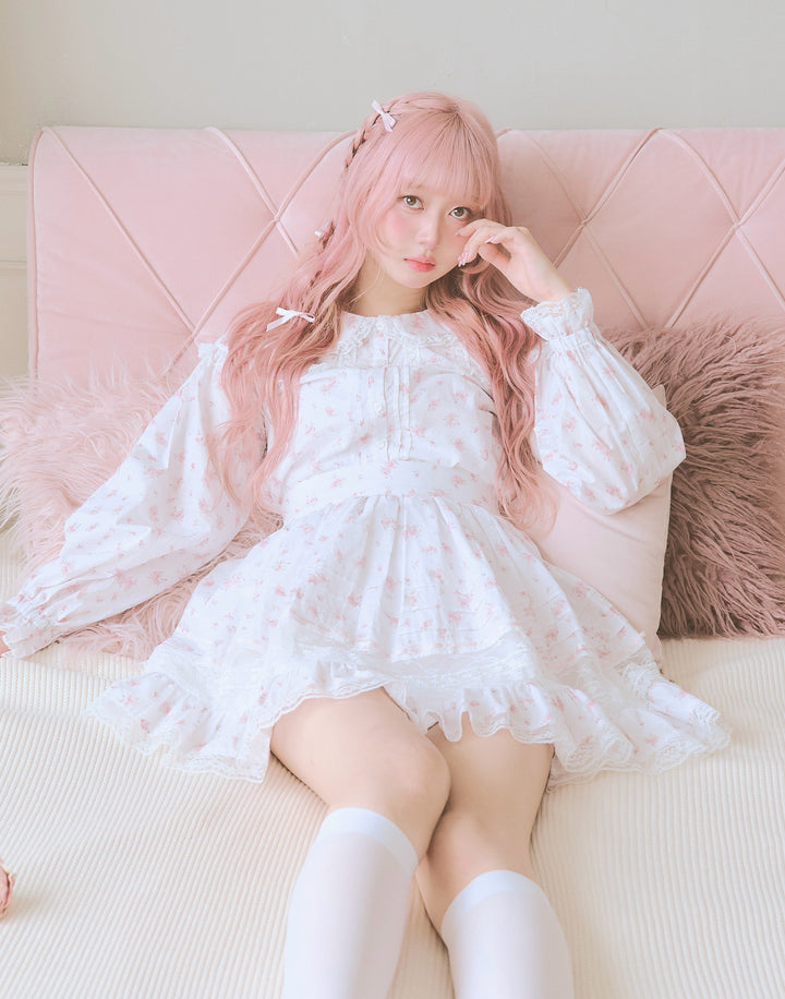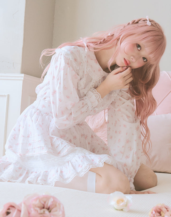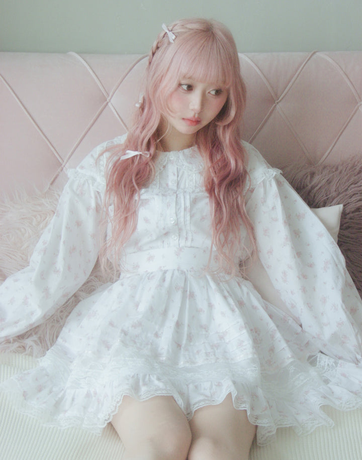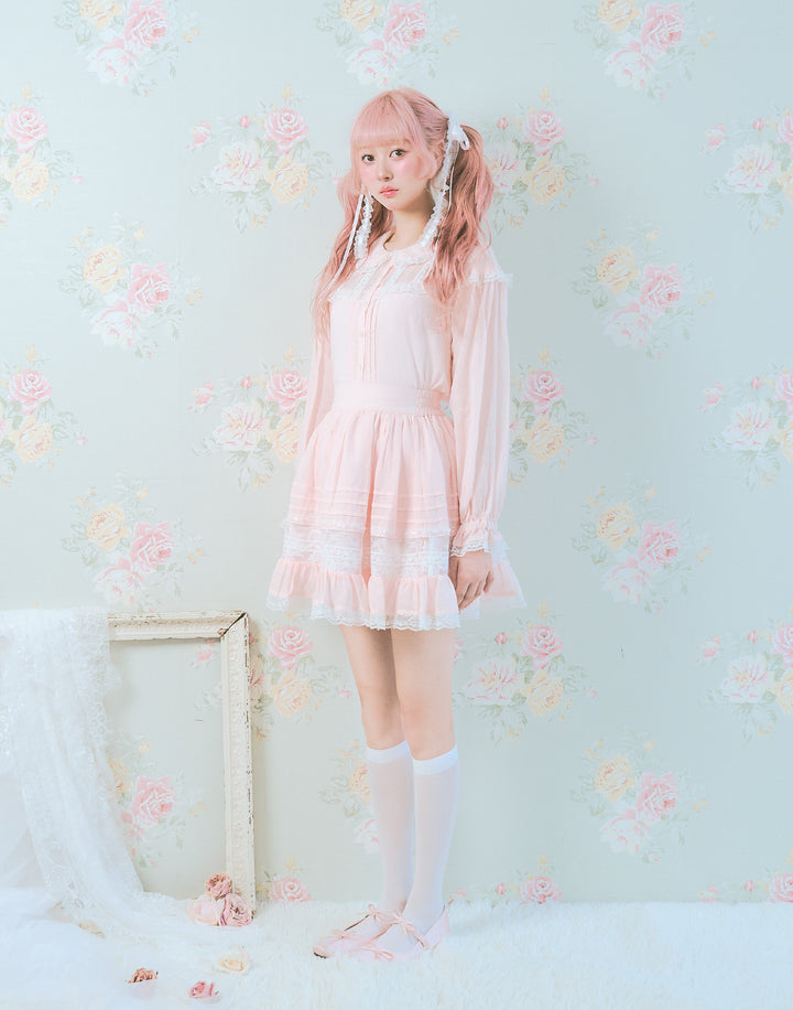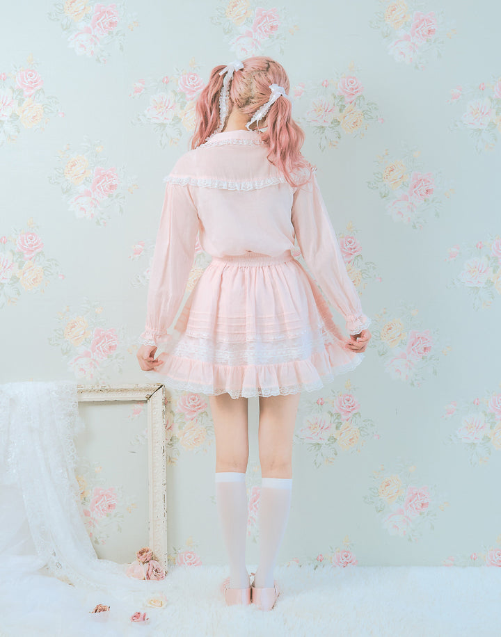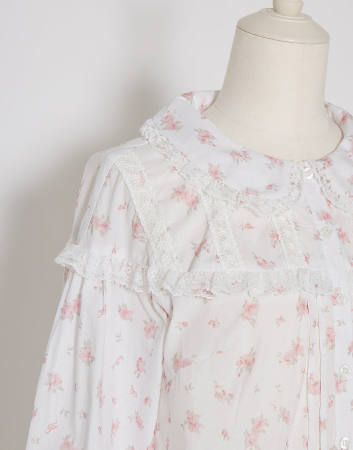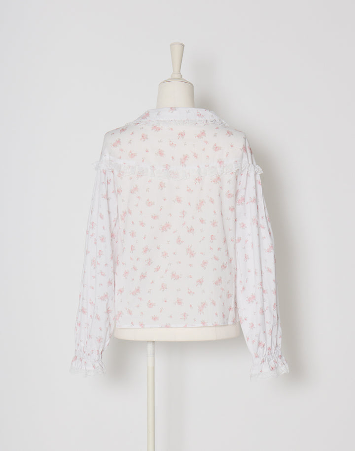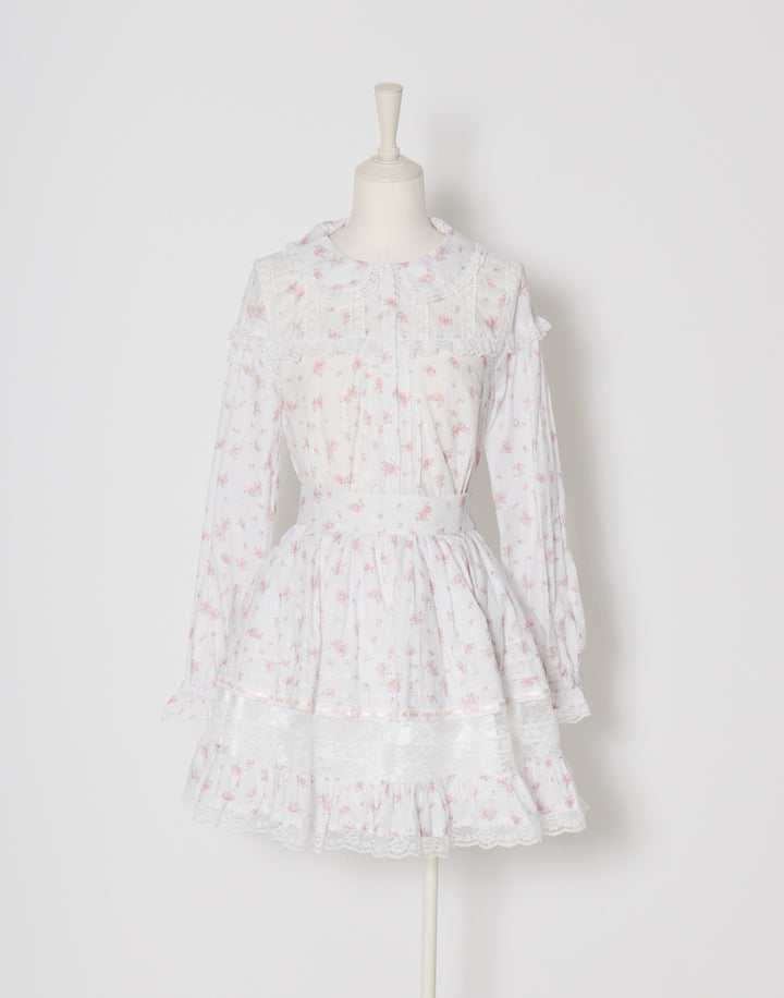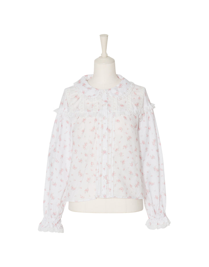 フロントは繊細なピンタックとレースで華やかに、袖口にはゴムを使用し着心地の良さにこだわったデザイン。