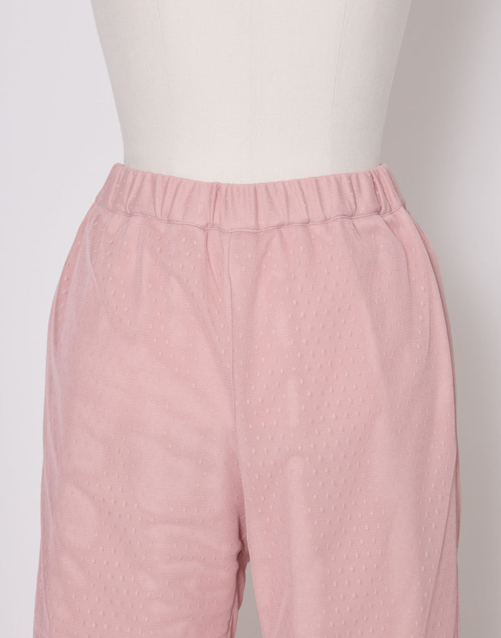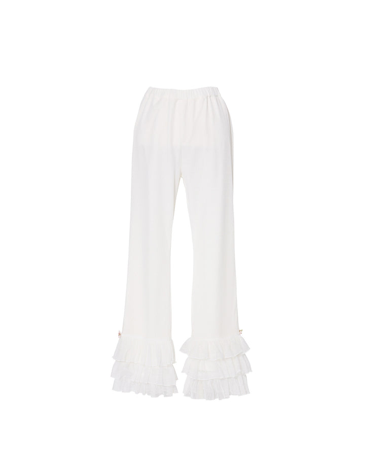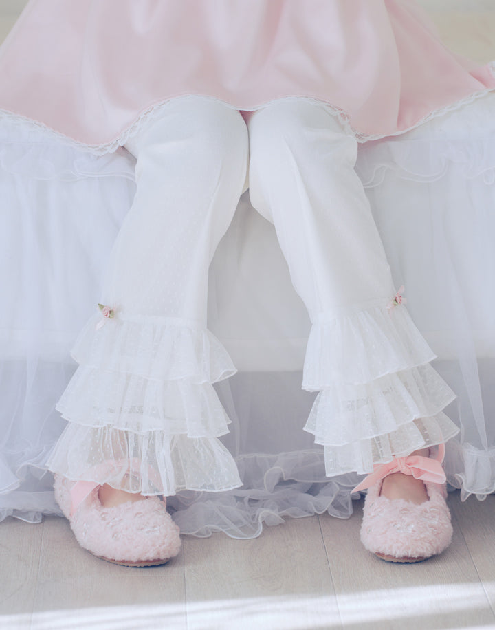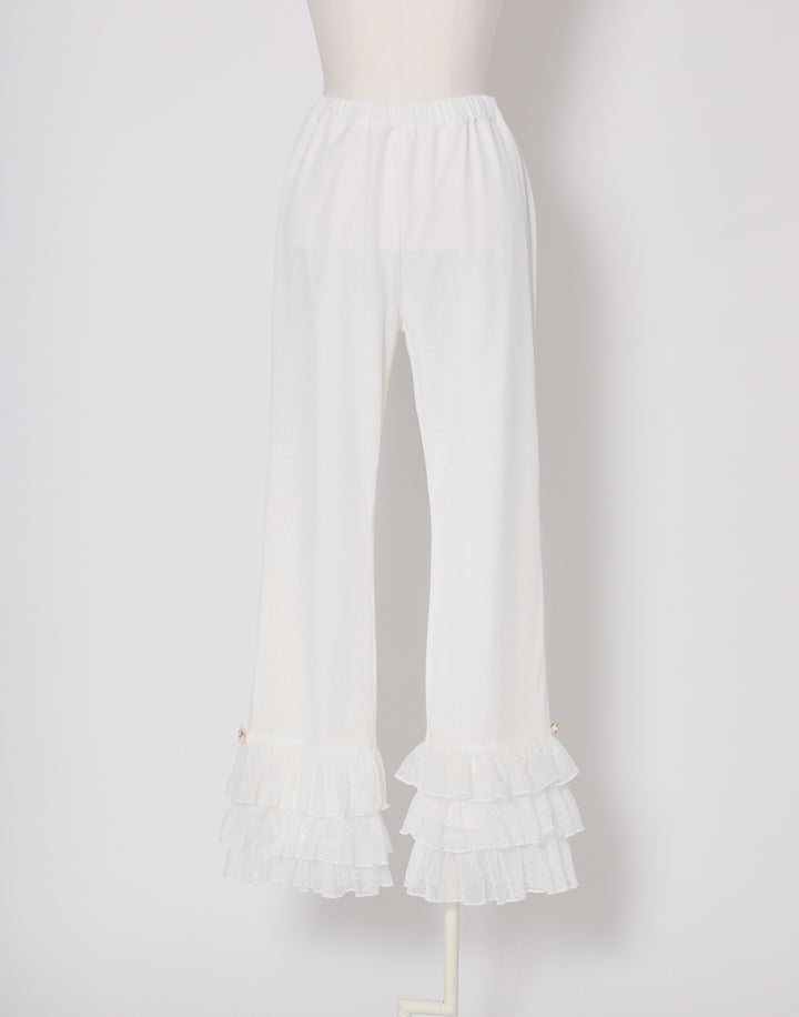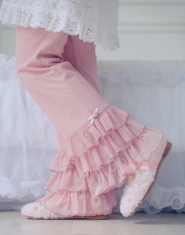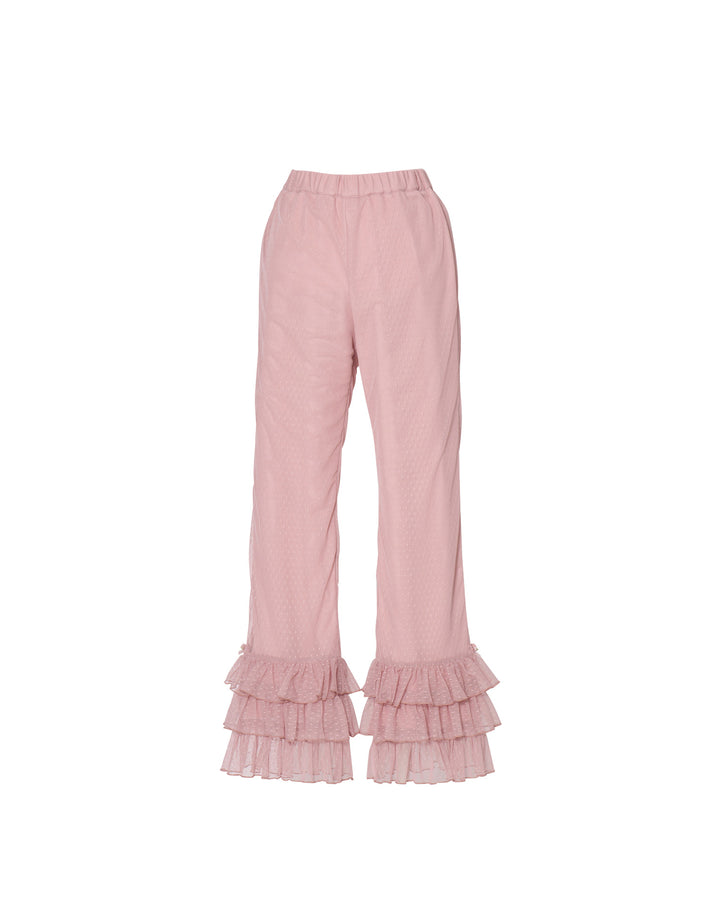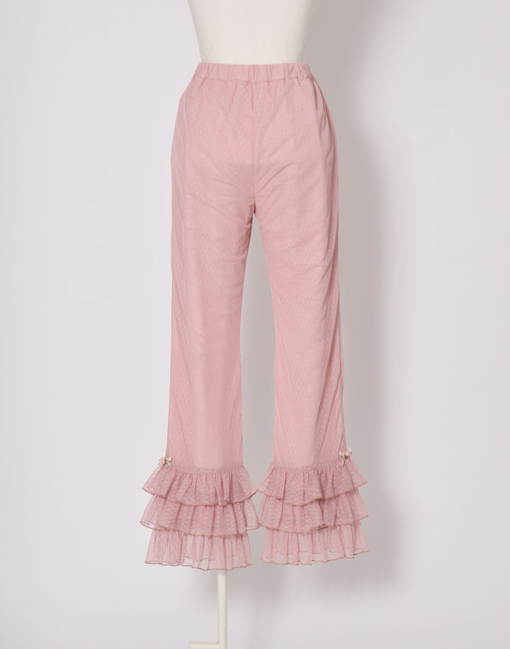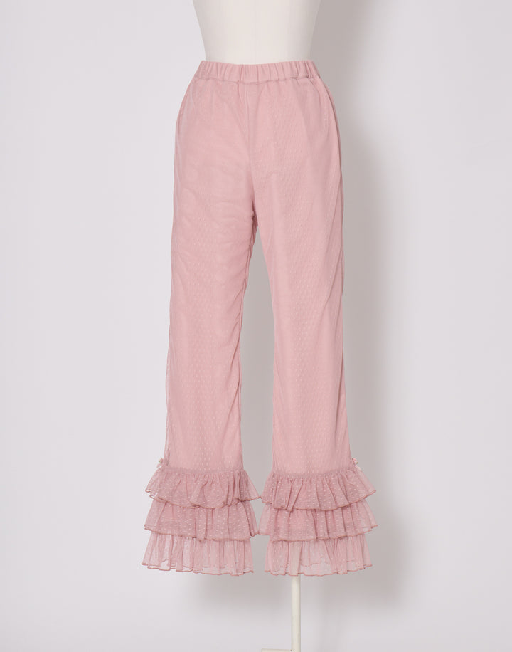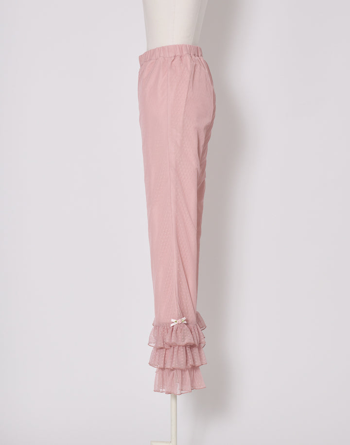 柔らかなドット柄の生地に、裾へ向かってふんわりと重なるチュールのフリルが繊細でロマンティックな印象なパンツ。普段のリラックスシーンを特別にしてくれる、上質感のある一着です。ウエストは全てゴムなので着心地にもこだわっています。