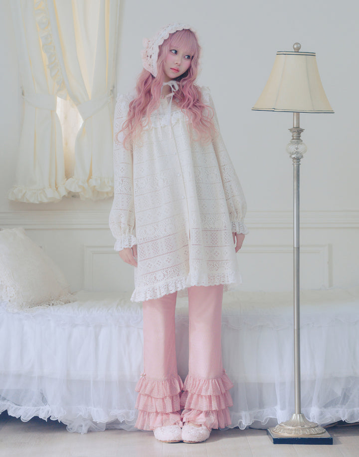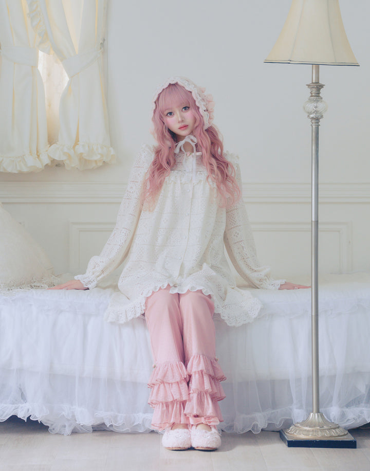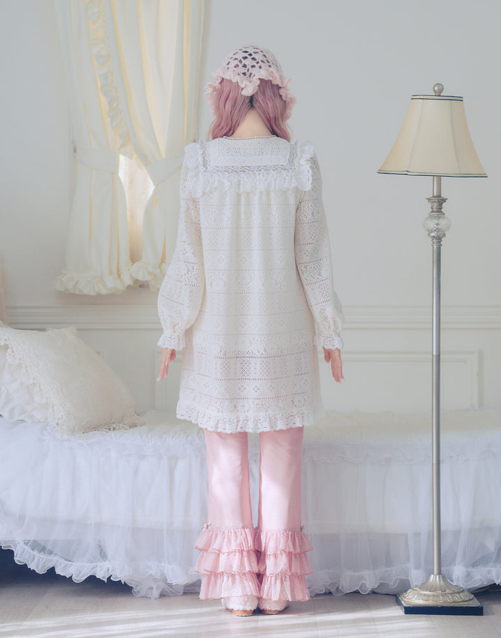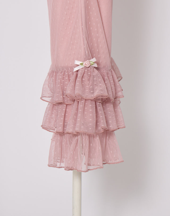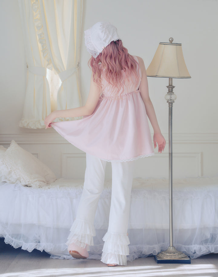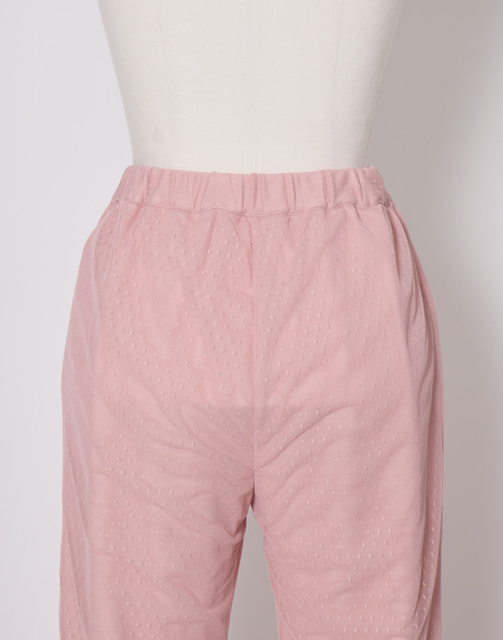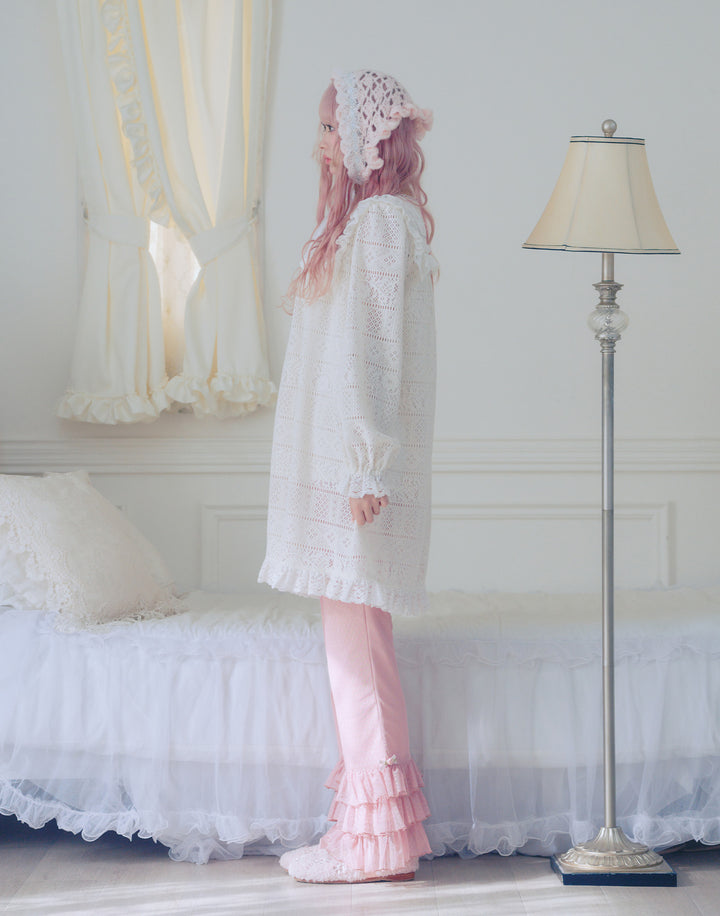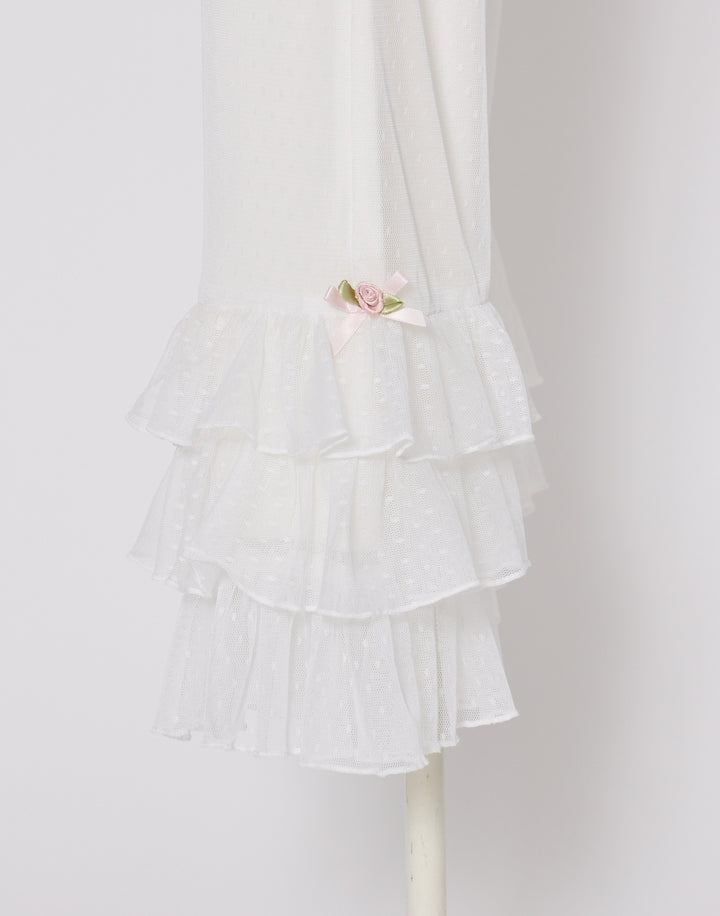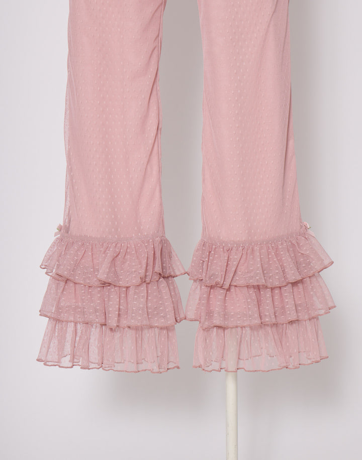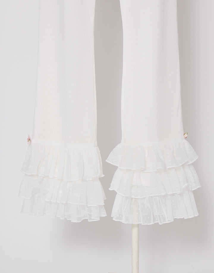 柔らかなドット柄の生地に、裾へ向かってふんわりと重なるチュールのフリルが繊細でロマンティックな印象なパンツ。普段のリラックスシーンを特別にしてくれる、上質感のある一着です。ウエストは全てゴムなので着心地にもこだわっています。