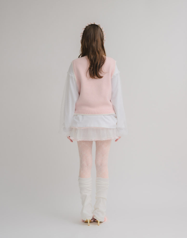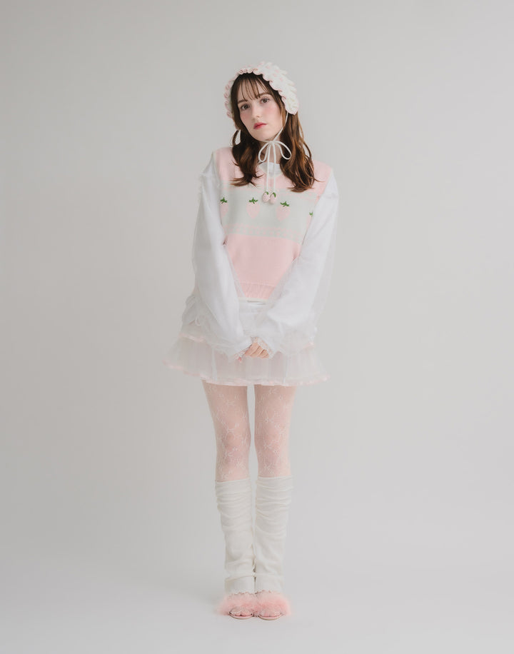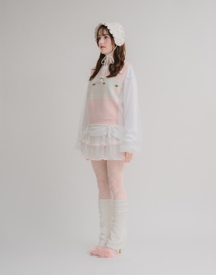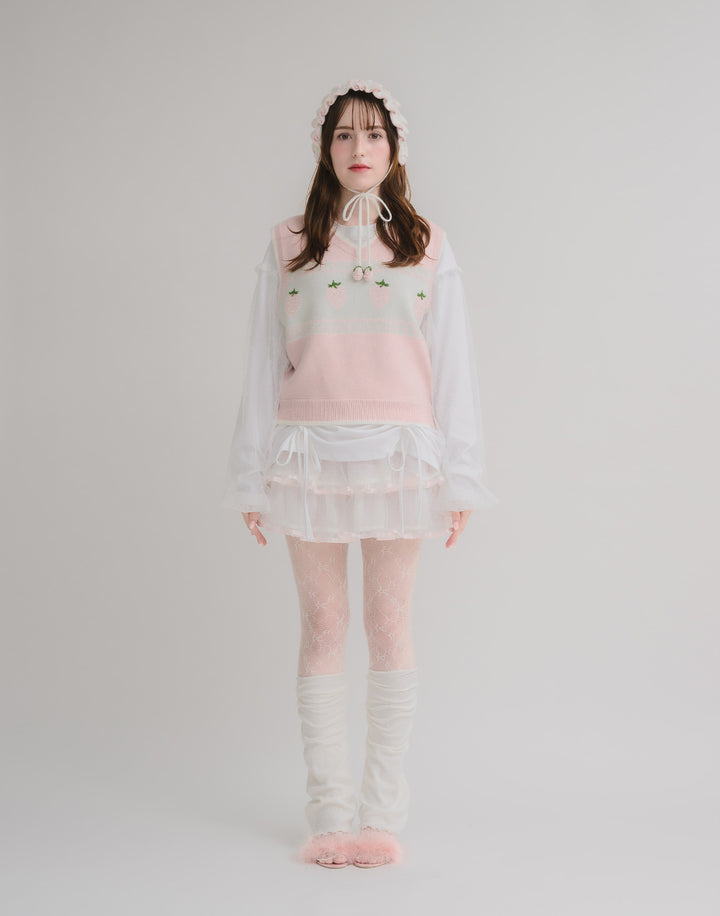 トレンドのフリルミニスカート。Lolimeらしいガーリーなドットチュールで、流行をおさえつつもひと味違う一枚になっています。チュールの裾にはよく見るとリボンがあしらわれているのがポイントです。
