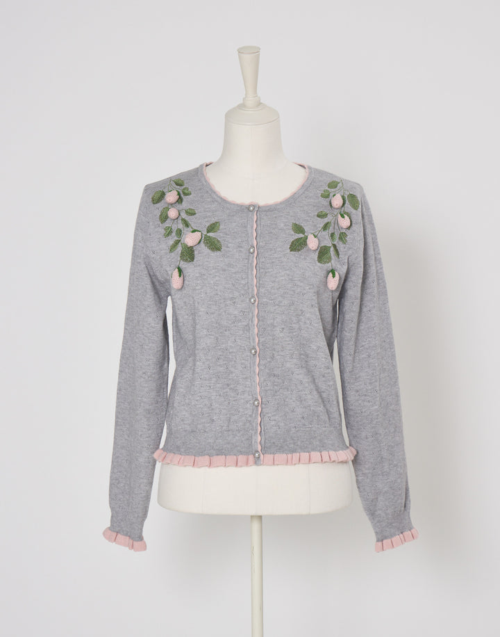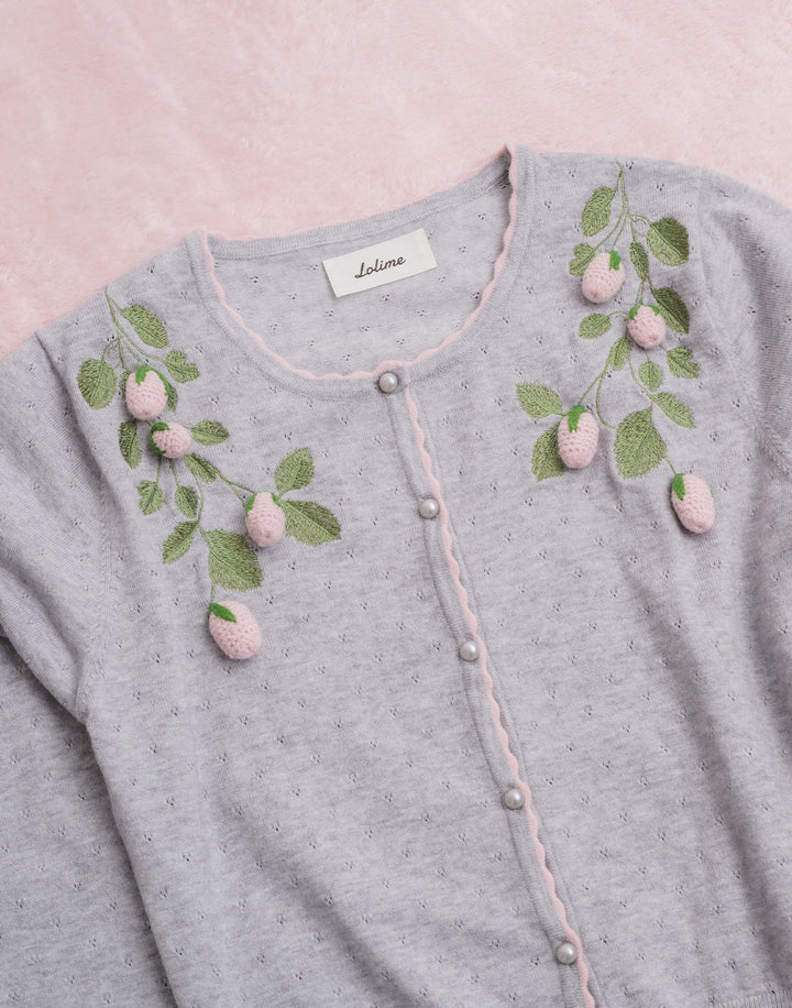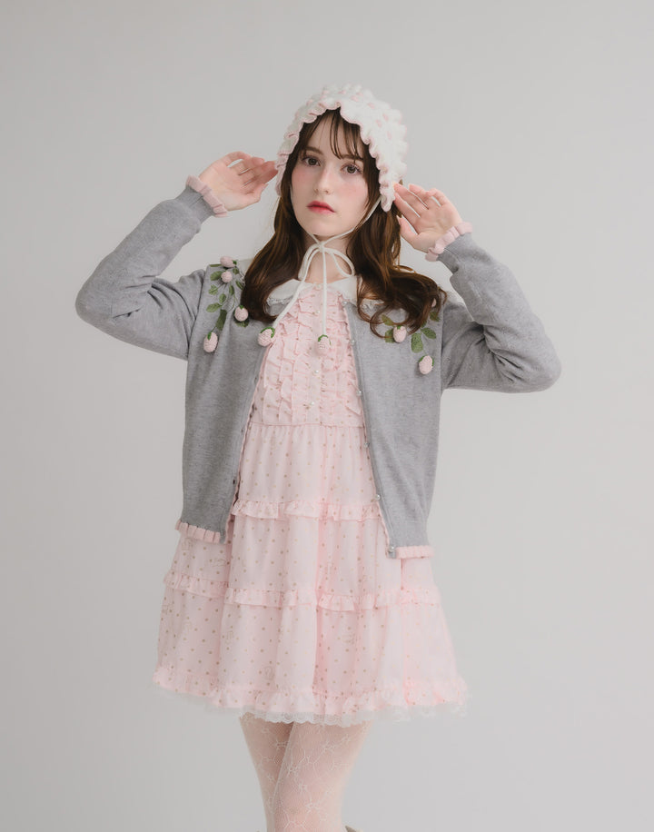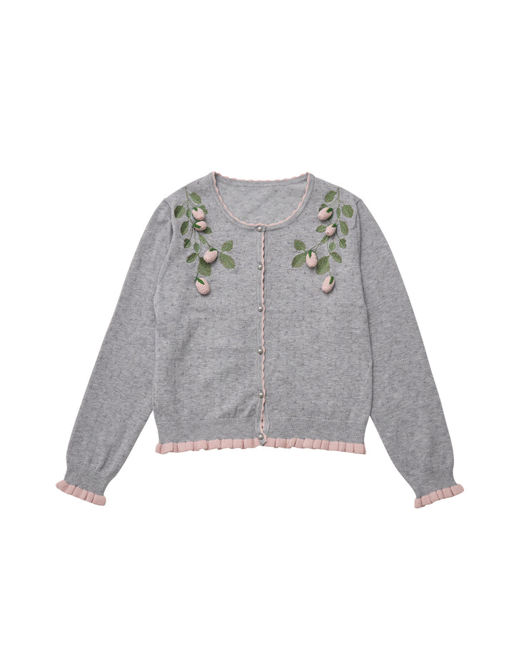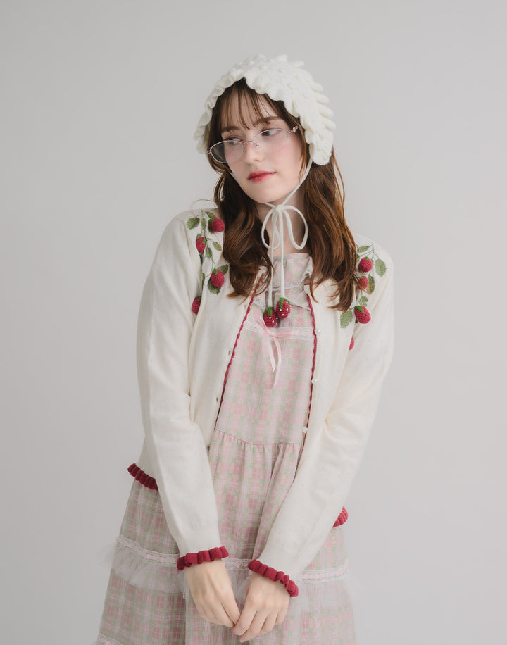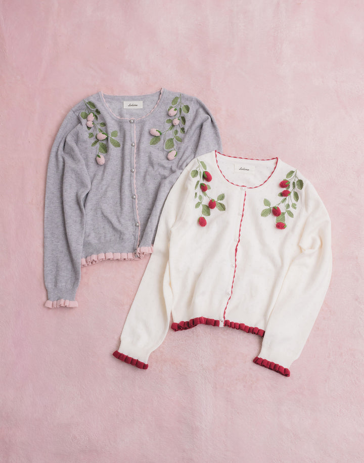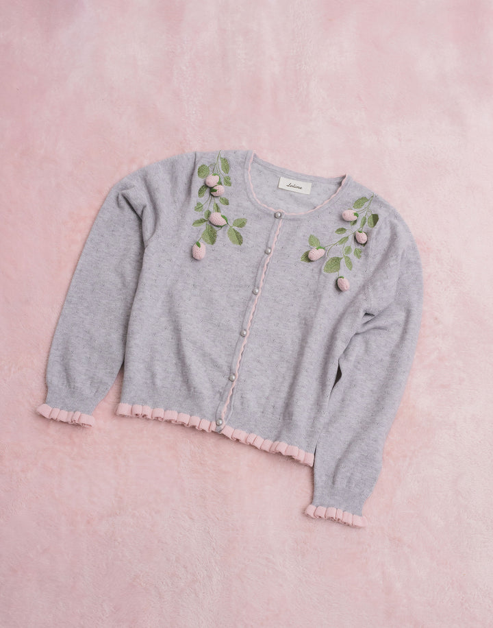 立体的ないちごのモチーフがついた、柔らかく肌触りのいいカーディガン。