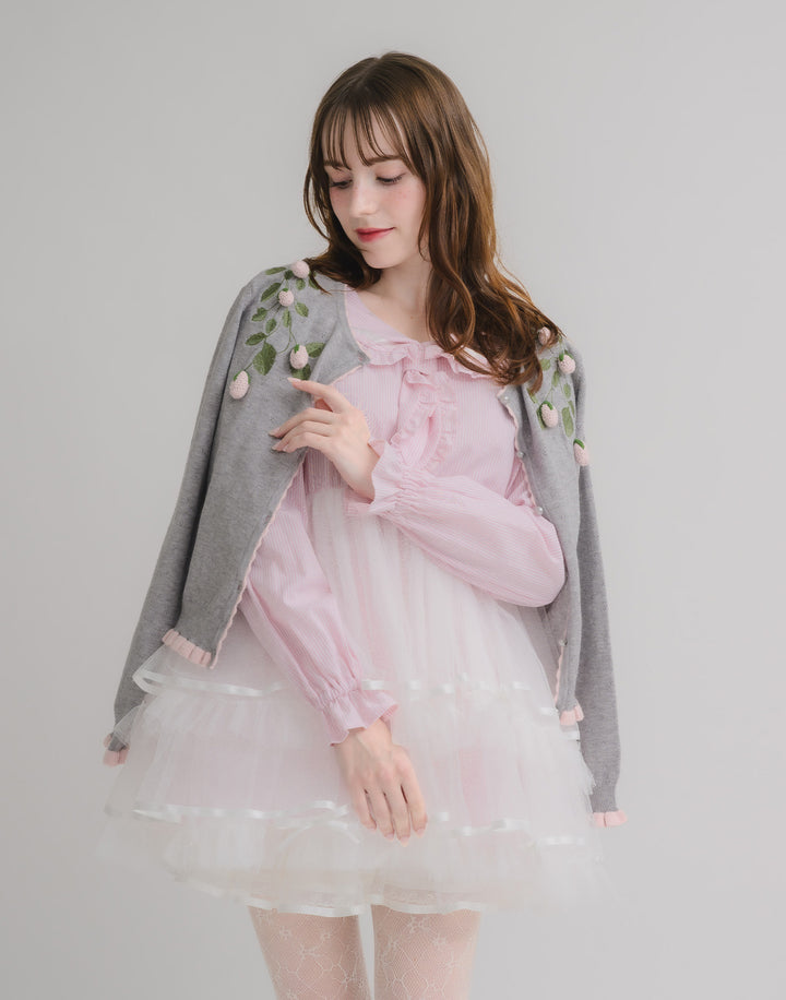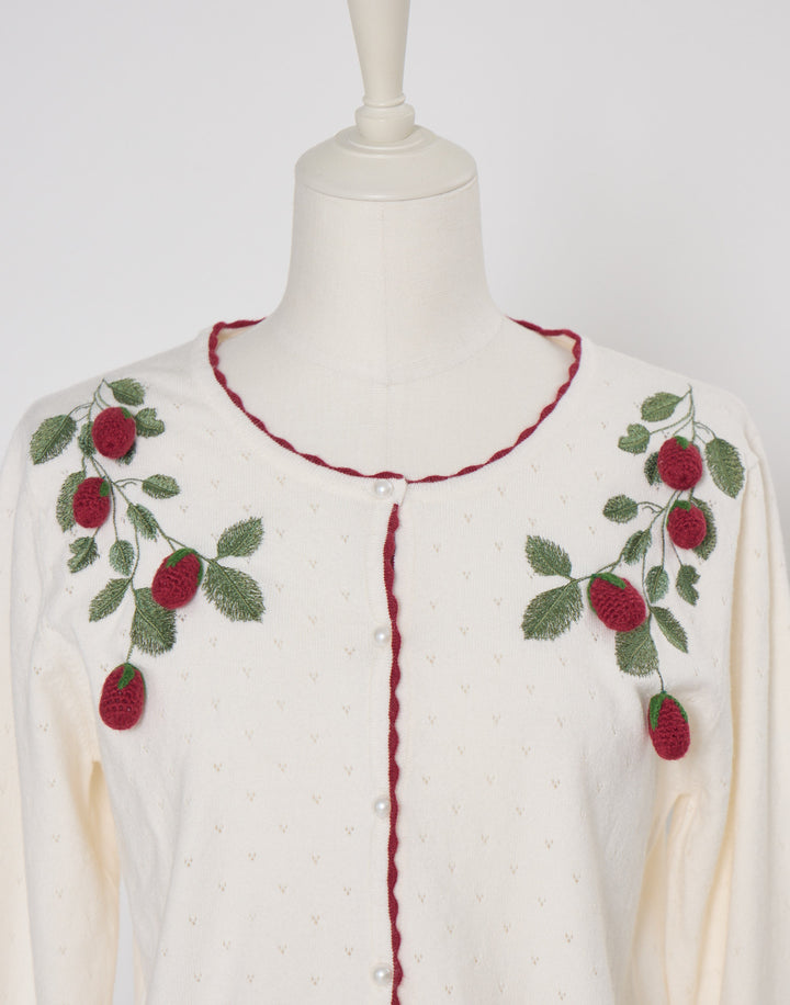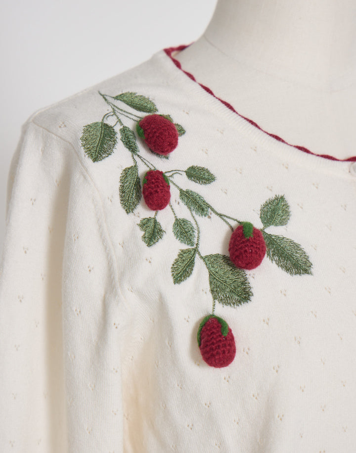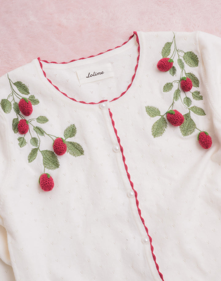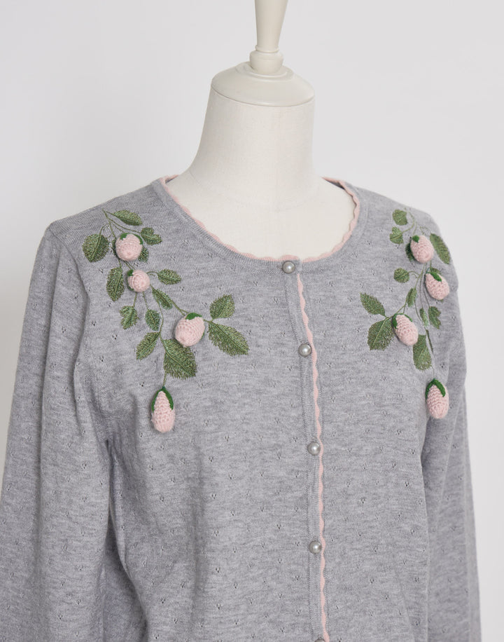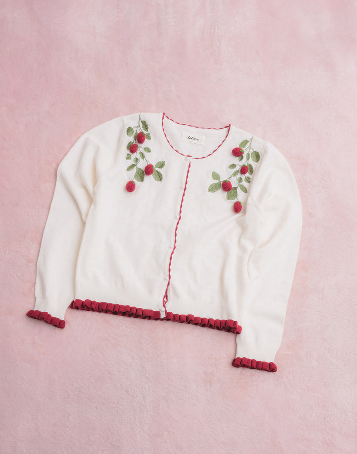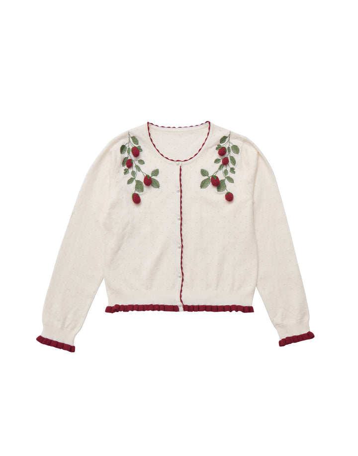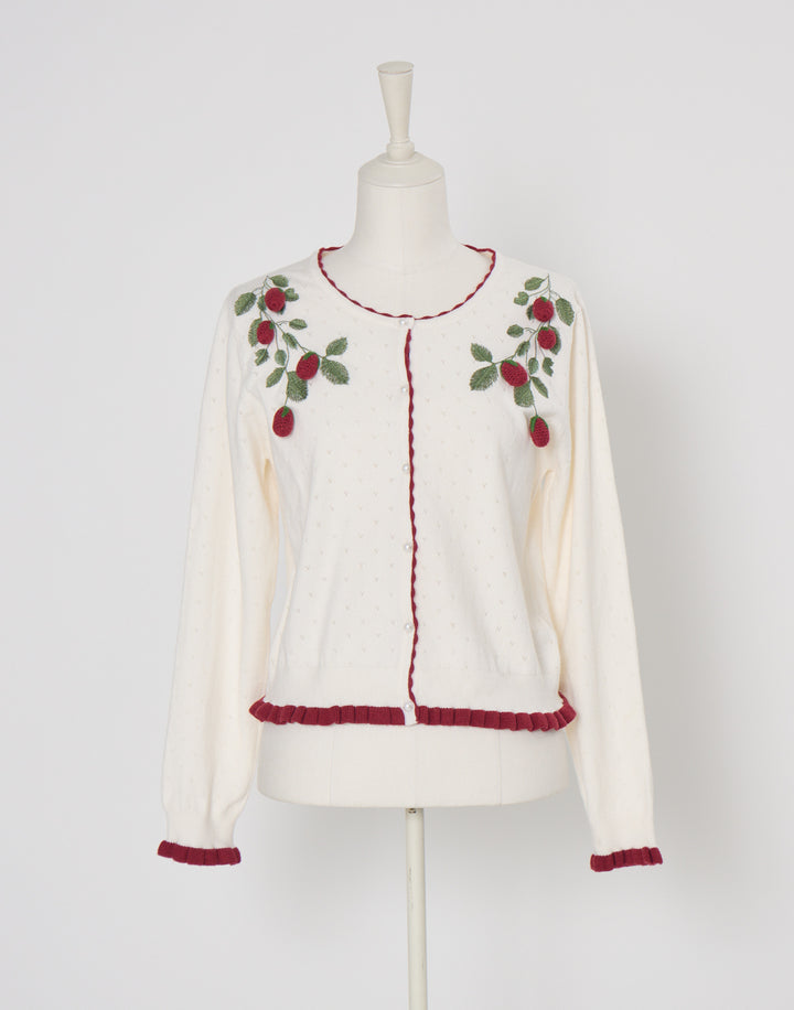 立体的ないちごのモチーフがついた、柔らかく肌触りのいいカーディガン。