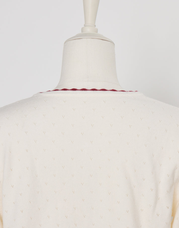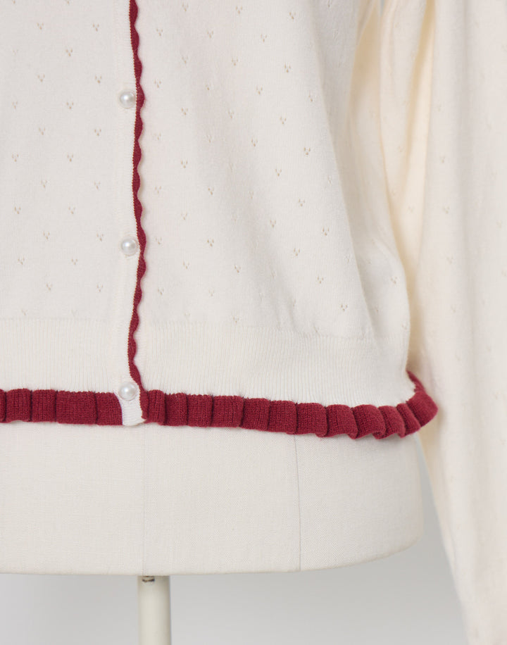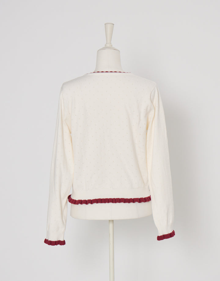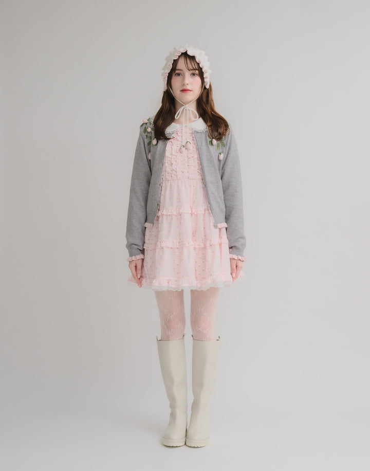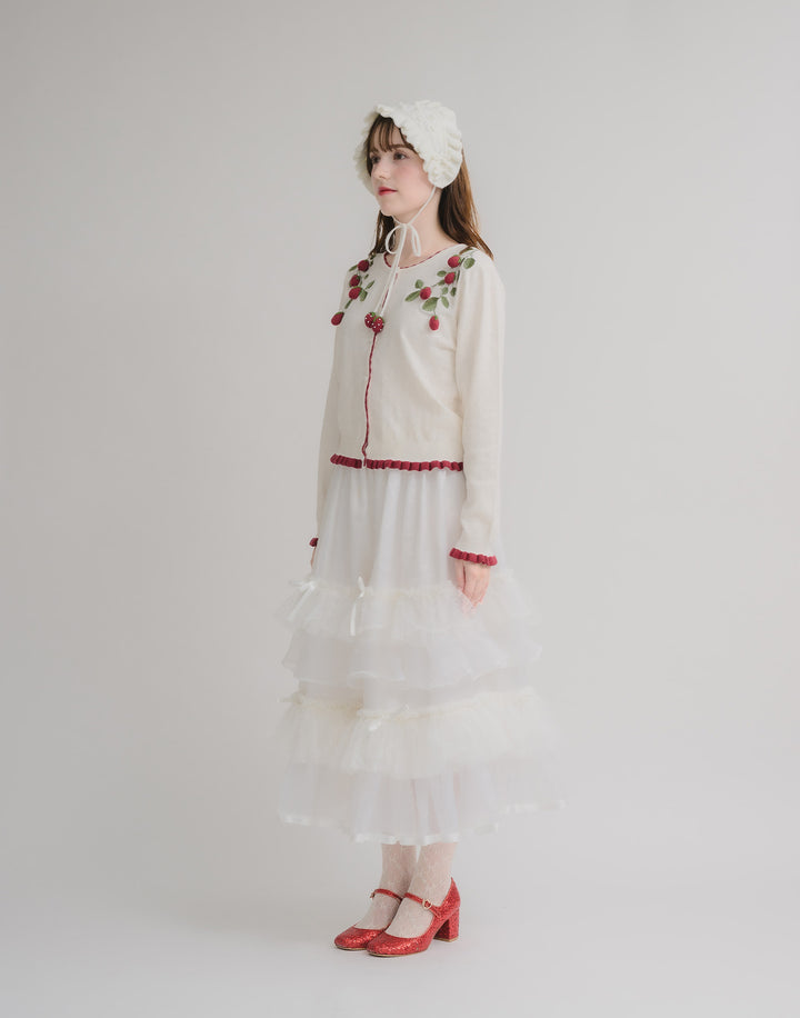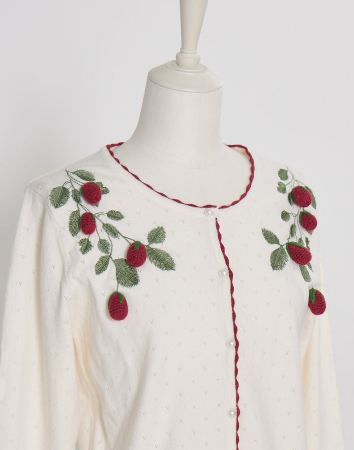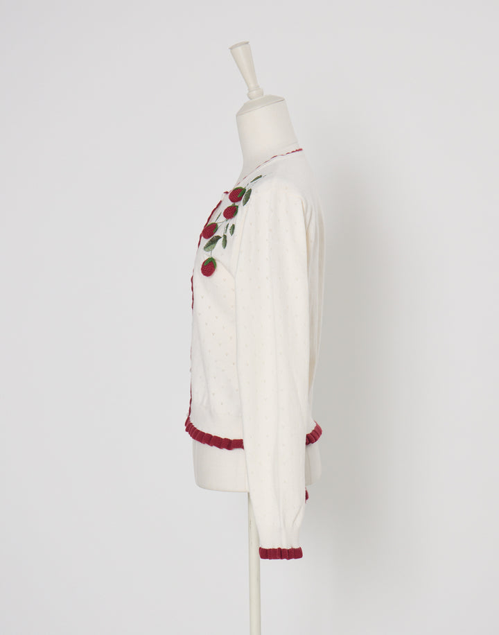 立体的ないちごのモチーフがついた、柔らかく肌触りのいいカーディガン。