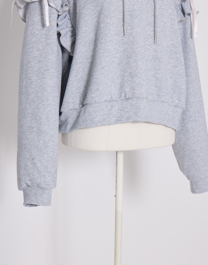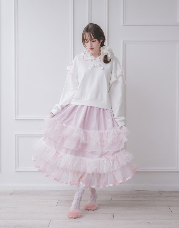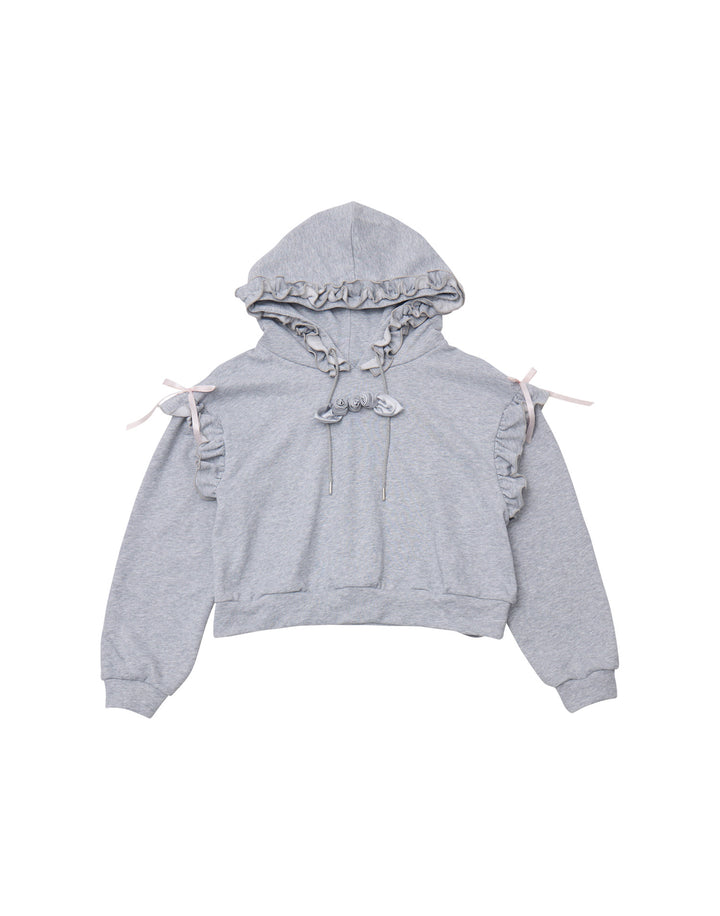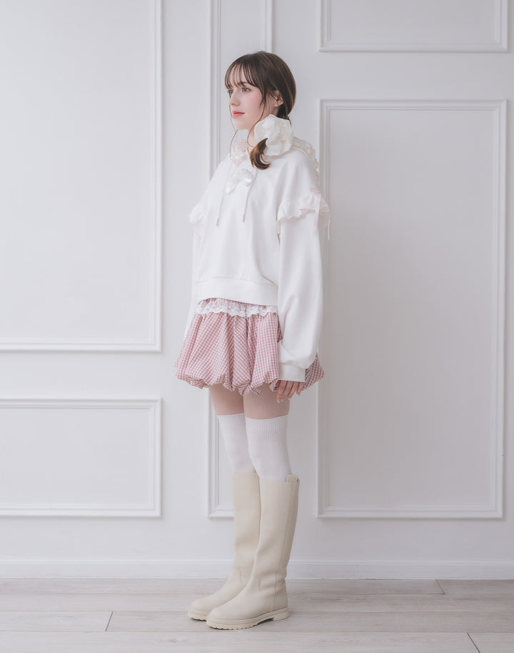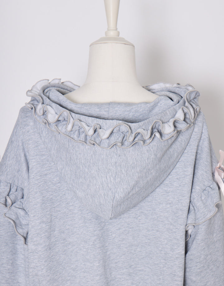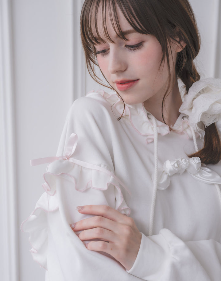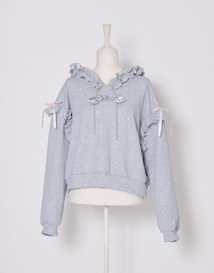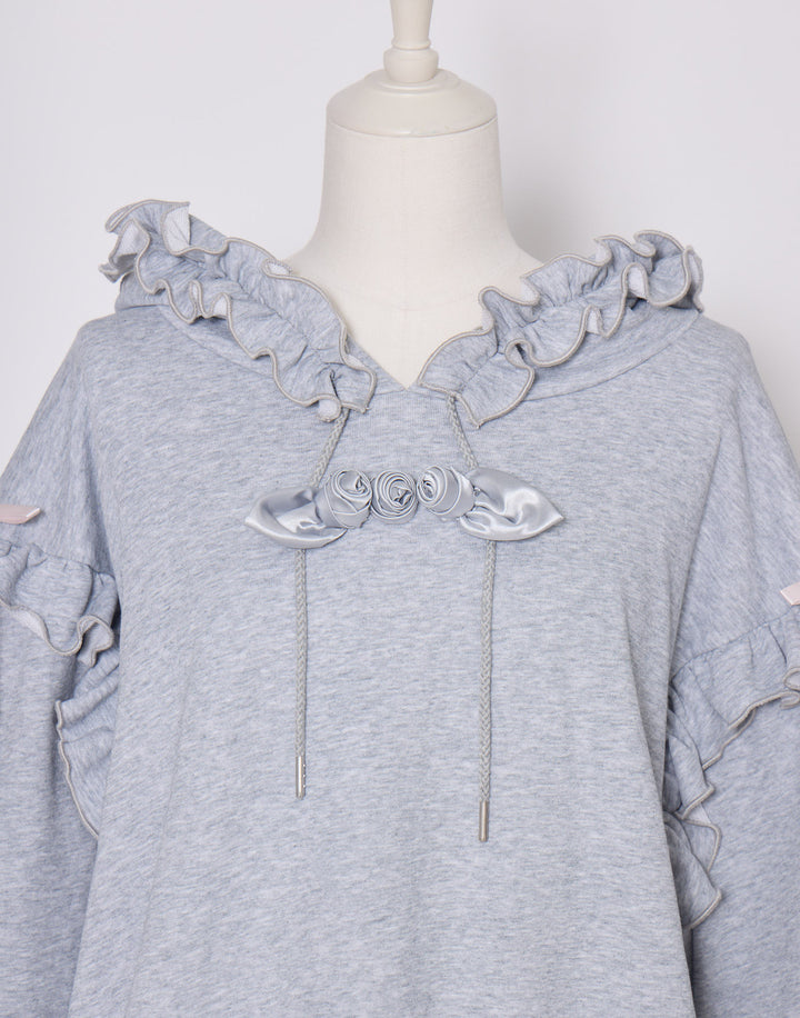 サテン生地で作られた立体的なローズモチーフと、袖のリボンがポイントのスウェットトップス。Lolimeらしくフードと袖にフリルをあしらったガーリーなアイテムです。スウェット素材でゆったりとした着心地です。
